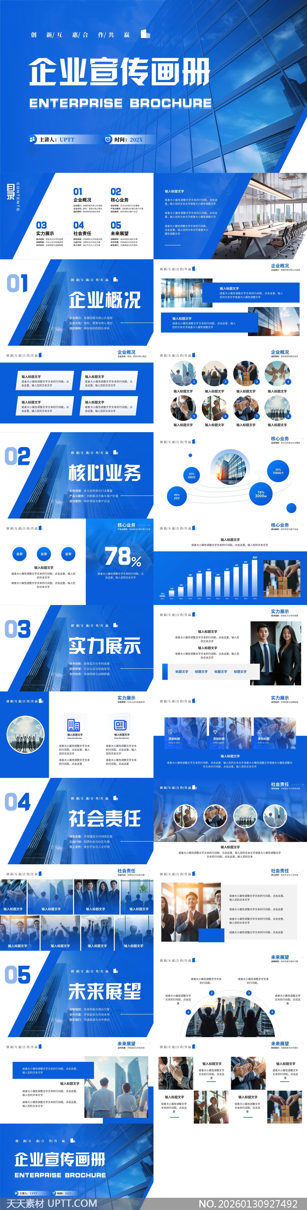 本模板采用深蓝渐变与几何线条营造现代科技感,支持企业概况、核心业务(含百分比/柱状图可视化)、技术实力(团队与成果展示)、社会责任(公益与合作场景)及未来战略等多维度内容灵活编排;适用于融资路演、政府汇报、年度总结及展会推介等正式场合,所有文字框均预留智能占位符,便于快速替换图文,提升专业呈现效率与品牌调性统一性。【 素材唯一编号 20260130927492 】,企业宣传类蓝色风格PPTX格式素材下载,文件格式为.PPTX,下载完成后的文件为一个压缩包,素材压缩包大小51.95 MB,请解压后用相应软件打开。
