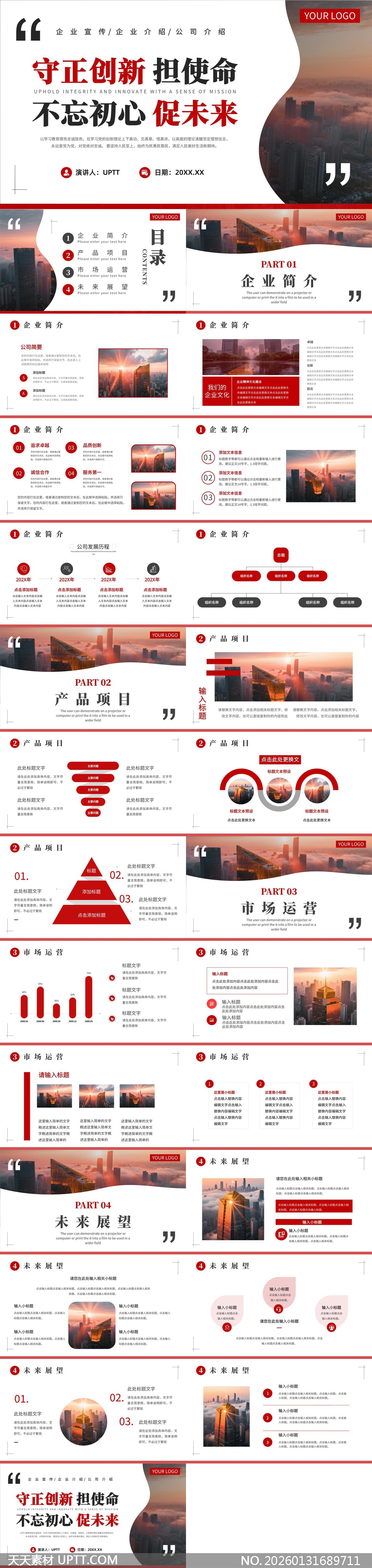本PPT模板采用大气稳重的红金配色与城市剪影背景,融合现代几何构图与留白设计,突出“守正创新、不忘初心”的精神内核;内置企业简介、产品项目、市场运营及未来展望四大模块;适用于国企/民企年度汇报、招商路演、党建融合宣传及战略发布会等正式场合,兼顾专业性与视觉感染力,助力高效传递企业使命与发展规划。【 素材唯一编号 20260131689711 】,企业宣传类红色风格PPTX格式素材下载,文件格式为.PPTX,下载完成后的文件为一个压缩包,素材压缩包大小11.2 MB,请解压后用相应软件打开。