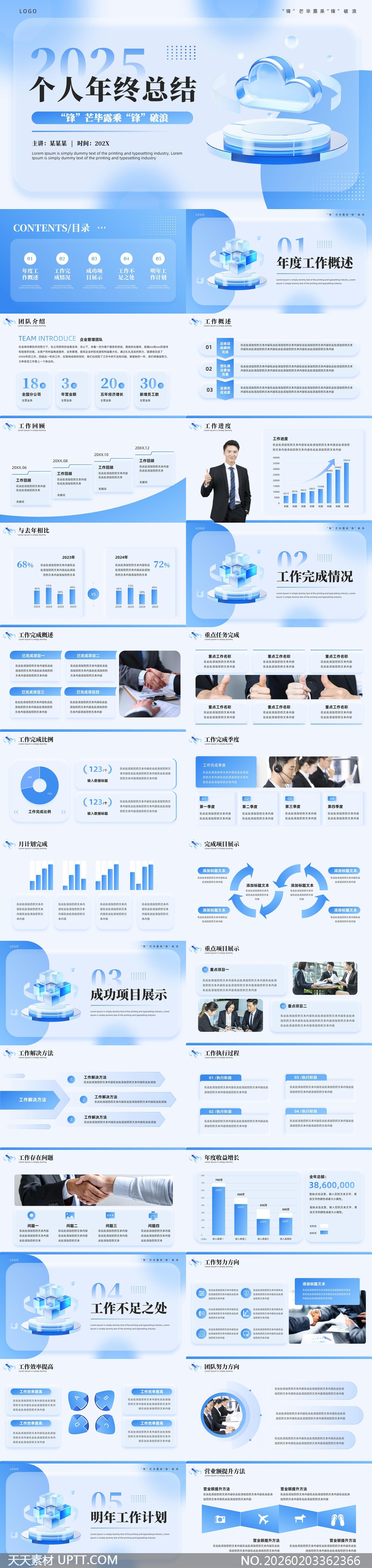本模板采用清新蓝调科技风格,融合3D立体云朵、晶格立方体与动态数据图表等现代视觉元素,营造专业又不失活力的汇报氛围;内容结构完整覆盖年度工作概述、成果展示、问题反思与未来规划五大核心模块,并预留团队介绍、重点项目、月度计划等实用版式,适用于企业员工、管理者及项目负责人在年终述职、绩效复盘或向上级汇报等正式场合高效呈现工作实绩与战略思考,提升演示专业度与说服力。【 素材唯一编号 20260203362366 】,述职汇报类蓝色风格PPTX格式素材下载,文件格式为.PPTX,下载完成后的文件为一个压缩包,素材压缩包大小12.69 MB,请解压后用相应软件打开。
