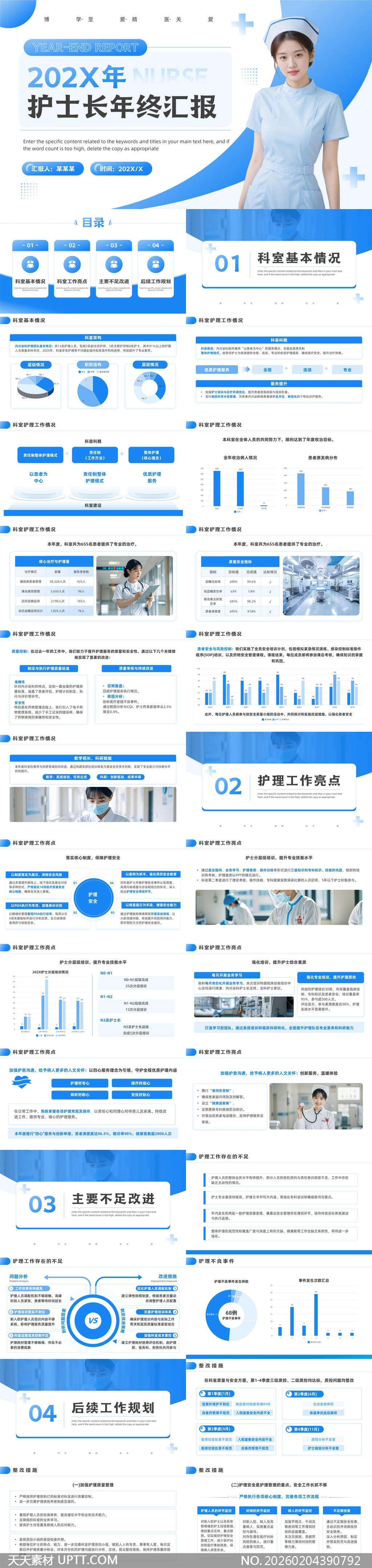 本模板采用清新蓝白配色与医疗元素融合设计,内置科室概况、工作亮点、问题改进及后续规划四大核心模块,数据看板与实拍护士场景图灵活嵌入;内容结构清晰,适配护理部年度总结、科室述职、质量改进汇报等正式场合,兼顾信息严谨性与呈现美观度,助力医护人员高效输出专业、有温度的工作成果展示。【 素材唯一编号 20260204390792 】,述职汇报类蓝色风格PPTX格式素材下载,文件格式为.PPTX,下载完成后的文件为一个压缩包,素材压缩包大小16.68 MB,请解压后用相应软件打开。