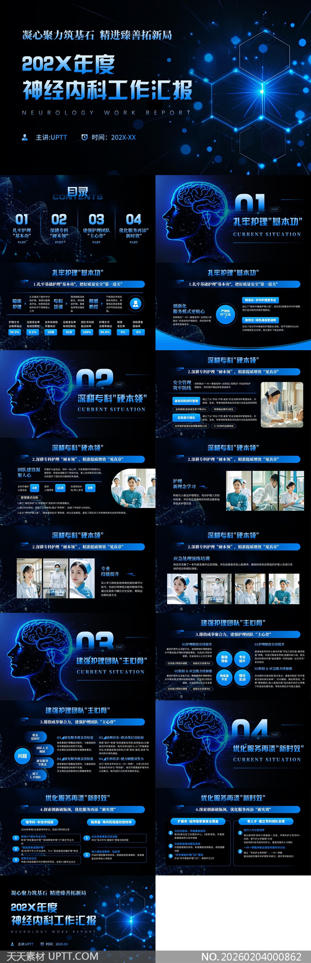 本模板采用深邃蓝调科技视觉语言,融合神经元网络、3D脑模型与六边形数据流等前沿设计元素,营造专业严谨又富有未来感的医学汇报氛围;内容结构清晰划分为“基本功”“硬本领”“主心骨”“新时效”四大模块;适用于神经内科年度总结、科室建设汇报、质量改进评审及学术交流展示,兼顾信息密度与视觉美感,助力医疗团队高效呈现专业成果与创新实践。【 素材唯一编号 20260204000862 】,述职汇报类蓝色风格PPTX格式素材下载,文件格式为.PPTX,下载完成后的文件为一个压缩包,素材压缩包大小45.36 MB,请解压后用相应软件打开。