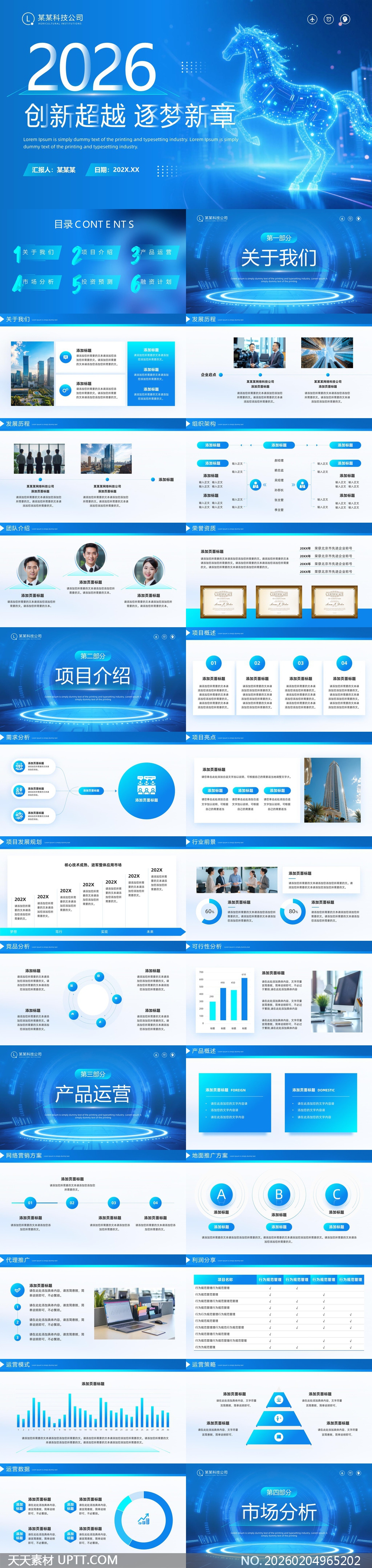 本模板以深邃科技蓝为主色调,融合动态光效粒子与数字化马匹意象,营造出兼具力量感与未来科技感的视觉氛围;内含“关于我们”“项目介绍”“产品运营”“市场分析”四大核心模块,搭配环形图、阶梯图、时间轴、组织架构等;适用于高科技企业年度战略发布会、创投路演、内部复盘汇报及品牌升级提案等高规格场景,助力用户高效呈现前瞻性规划与数据化成果,提升演示专业度与视觉冲击力。【 素材唯一编号 20260204965202 】,企业宣传类蓝色风格PPTX格式素材下载,文件格式为.PPTX,下载完成后的文件为一个压缩包,素材压缩包大小55.61 MB,请解压后用相应软件打开。