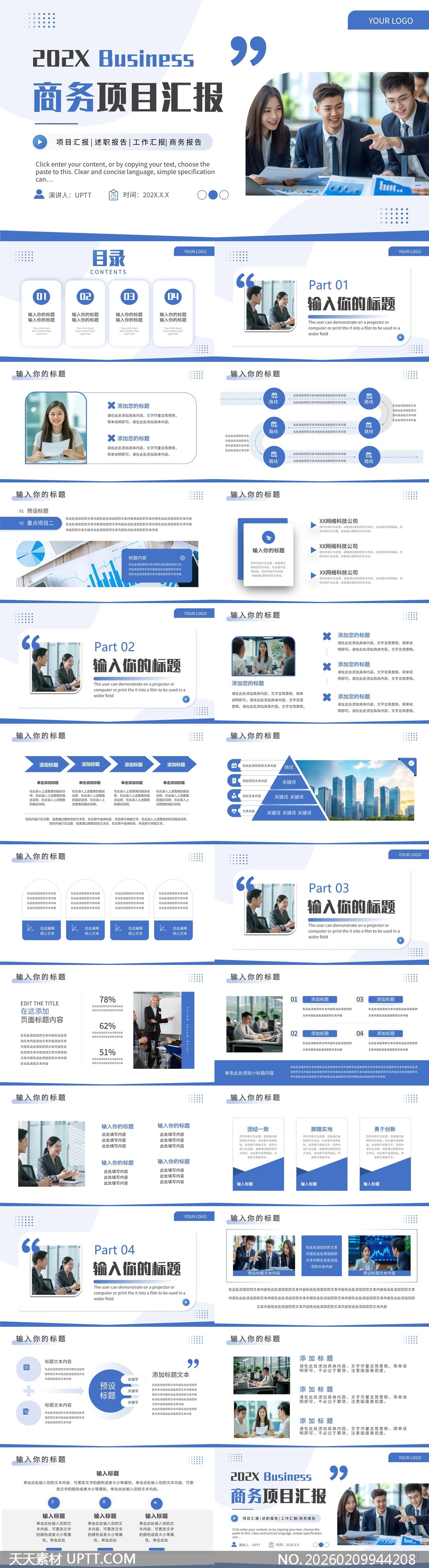 本模板采用沉稳蓝白配色与现代几何线条设计,营造专业、清爽的商务视觉氛围;内含项目汇报、述职报告、工作复盘、商务提案等多场景适配页面,涵盖目录导航、数据图表、团队协作、关键词提炼、时间轴流程及总结展望等实用模块,适配企业年度总结、季度复盘、部门述职及客户提案等正式场合,兼顾逻辑清晰性与视觉表现力,助力用户高效呈现专业成果。【 素材唯一编号 20260209944208 】,述职汇报类蓝色风格PPTX格式素材下载,文件格式为.PPTX,下载完成后的文件为一个压缩包,素材压缩包大小12.99 MB,请解压后用相应软件打开。