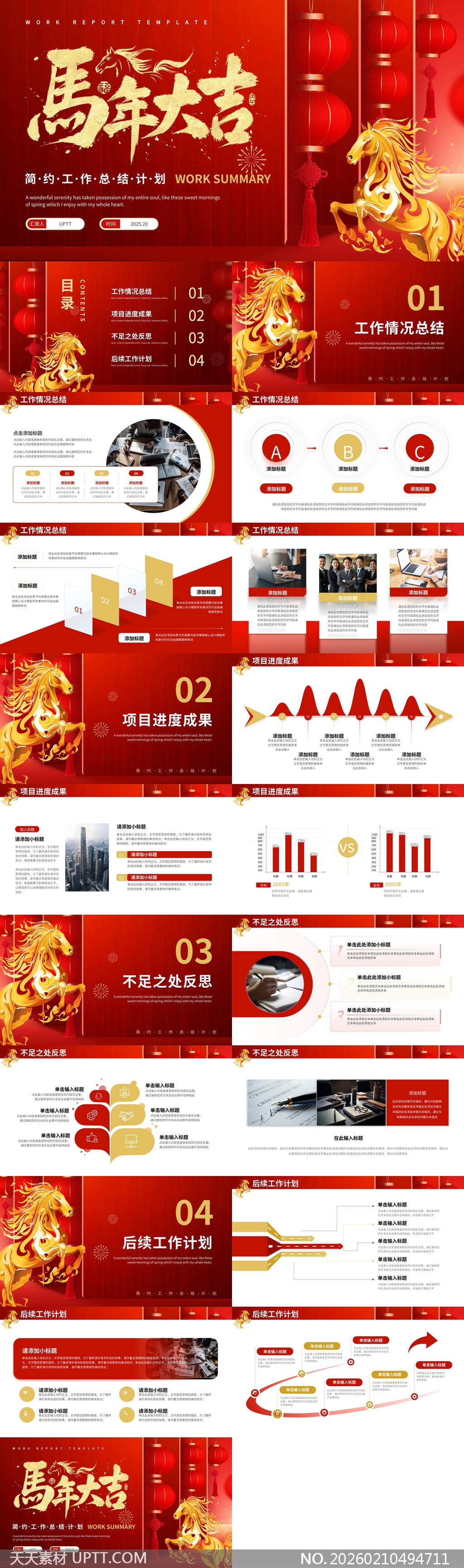 本模板以浓郁中国红为基调,融合烫金骏马、灯笼、祥云等传统吉祥元素,营造出喜庆热烈的节日氛围;涵盖工作总览、项目成果、反思与计划四大模块,适用于年终总结、季度汇报、新年规划等正式场合,尤其契合政府机关、国企及文化类单位在马年节点的述职展示需求,既彰显文化底蕴又提升演示质感。【 素材唯一编号 20260210494711 】,述职汇报类红色风格PPTX格式素材下载,文件格式为.PPTX,下载完成后的文件为一个压缩包,素材压缩包大小10.17 MB,请解压后用相应软件打开。