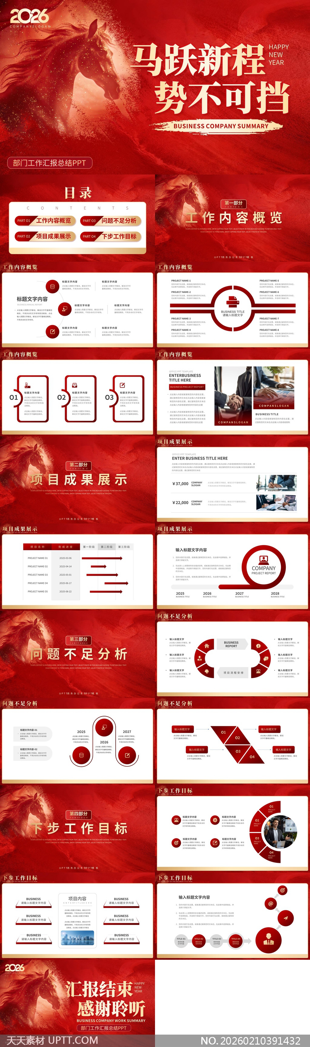 本模板以奔腾红马为视觉核心,融合金色光效与水墨质感营造磅礴气势,整体采用高级红金配色彰显企业活力与专业度;划分为工作概览、成果展示、问题分析与目标规划四大模块,适配年度总结、季度复盘及战略部署等正式汇报场景,助力团队高效呈现2026年工作全貌。【 素材唯一编号 20260210391432 】,述职汇报类红色风格PPTX格式素材下载,文件格式为.PPTX,下载完成后的文件为一个压缩包,素材压缩包大小6.22 MB,请解压后用相应软件打开。