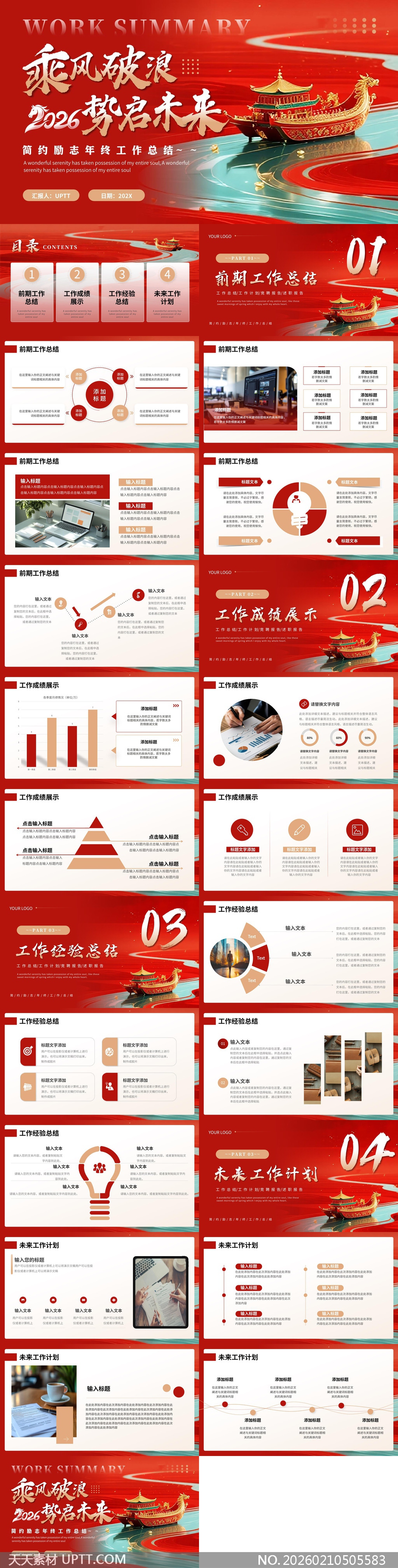 本PPT模板融合传统国潮元素与现代设计语言,以朱红、金箔为主色调,搭配祥云、龙舟、古建等意象营造恢弘大气的视觉氛围;划分为前期总结、成绩展示、经验提炼与未来规划四大模块,适用于企业年度述职、团队表彰大会、战略发布会等正式场合,助力用户高效呈现成果、凝聚共识、激发斗志,彰显文化自信与时代精神。【 素材唯一编号 20260210505583 】,述职汇报类红色风格PPTX格式素材下载,文件格式为.PPTX,下载完成后的文件为一个压缩包,素材压缩包大小17.48 MB,请解压后用相应软件打开。