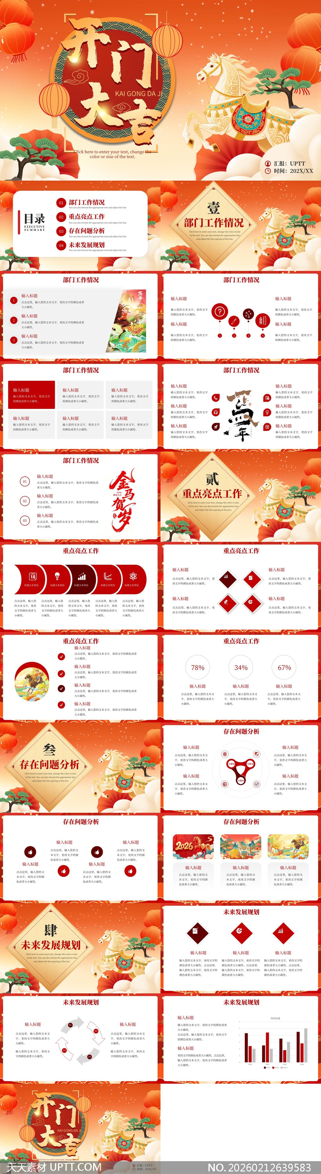 本模板以浓郁中国风为基调,涵盖工作汇报、亮点提炼、问题分析与未来规划四大模块,适配年终总结、季度复盘、项目启动会及新年工作部署等正式场合,兼顾专业性与文化韵味,助力用户高效打造兼具仪式感与实用性的高质量演示文稿。【 素材唯一编号 20260212639583 】,述职汇报类红色风格PPTX格式素材下载,文件格式为.PPTX,下载完成后的文件为一个压缩包,素材压缩包大小5.55 MB,请解压后用相应软件打开。