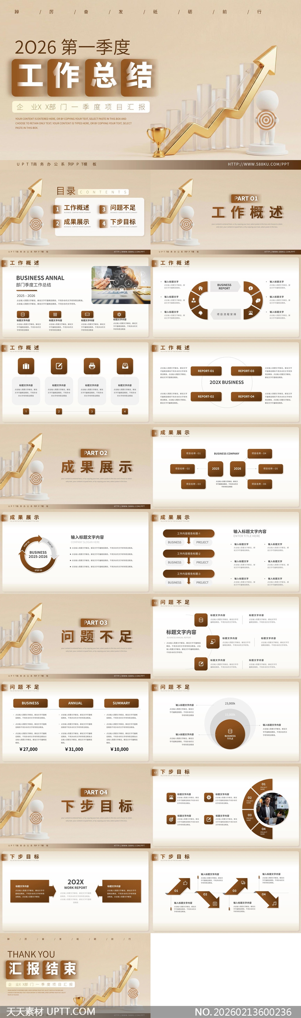 本模板采用高级香槟金与米褐配色,搭配立体箭头、奖杯、3D柱状图等商务元素,营造出稳重而不失活力的精英感;结构清晰划分为工作概述、成果展示、问题不足与下步目标四大模块,适配季度复盘、项目总结、管理层汇报等正式场合,兼顾专业性与视觉冲击力,助力企业高效呈现业绩亮点与战略规划。【 素材唯一编号 20260213600236 】,工作总结类黄色风格PPTX格式素材下载,文件格式为.PPTX,下载完成后的文件为一个压缩包,素材压缩包大小1.63 MB,请解压后用相应软件打开。