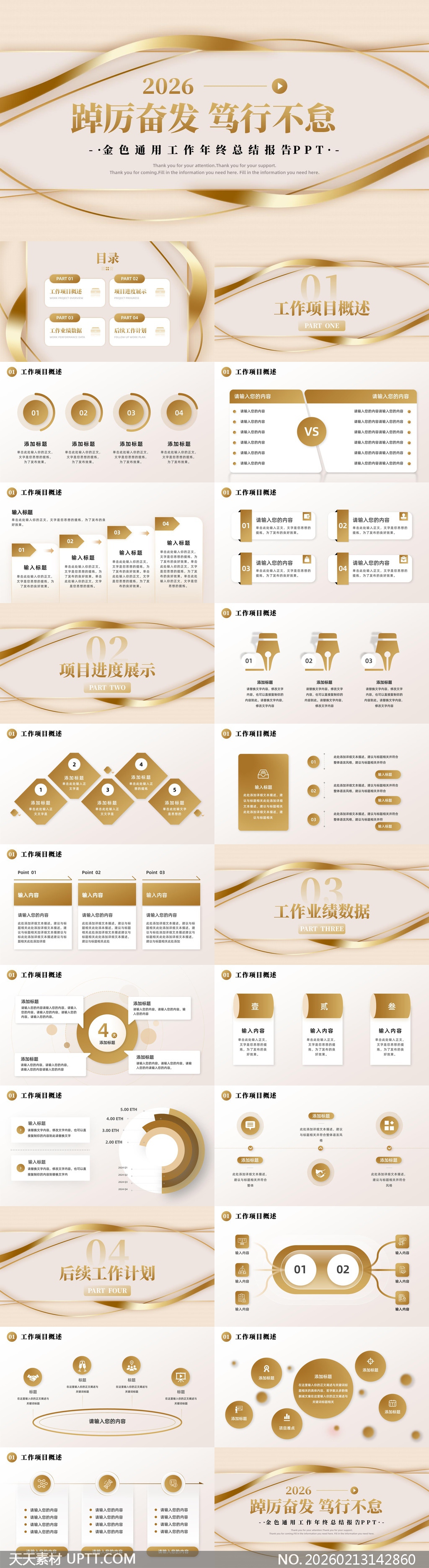 本模板采用高级香槟金与柔白渐变配色,搭配流畅丝带线条与立体几何元素,营造出沉稳而不失活力的商务质感;内含项目概述、进度追踪、业绩数据可视化及工作计划四大核心模块,适配年终总结、季度复盘、战略规划等正式汇报场景,助力职场人士快速打造高水准演示文稿。【 素材唯一编号 20260213142860 】,述职汇报类黄色风格PPTX格式素材下载,文件格式为.PPTX,下载完成后的文件为一个压缩包,素材压缩包大小4.72 MB,请解压后用相应软件打开。