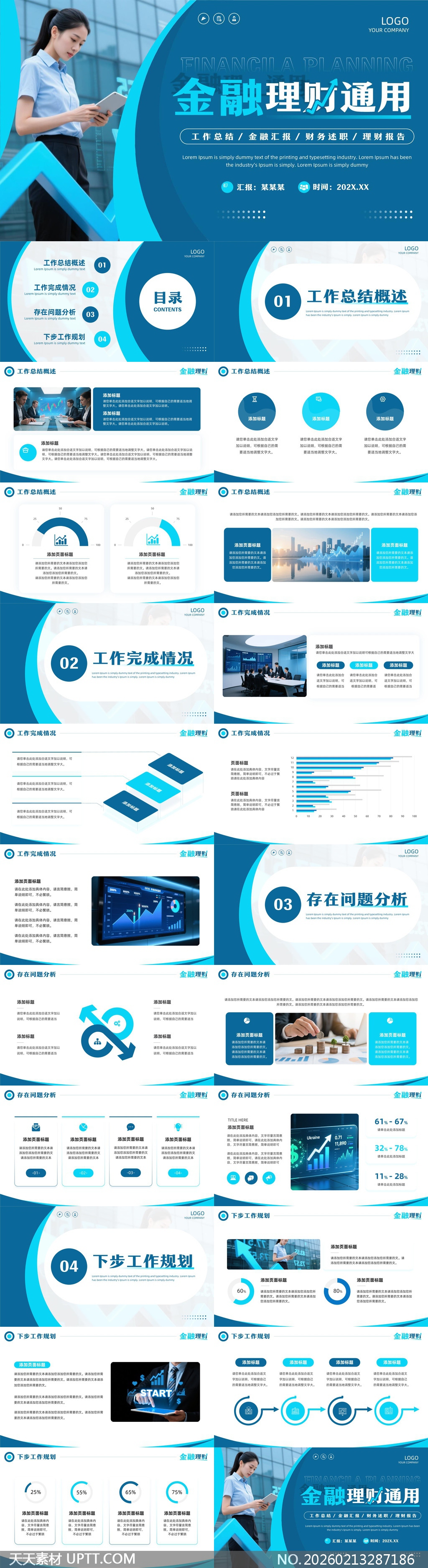 本模板采用清爽蓝白配色与现代几何线条,内含工作概述、完成情况、问题分析及下步规划四大核心模块,适配季度/年度金融理财汇报、部门述职、项目复盘等场景,兼顾逻辑清晰性与设计高级感,助力用户高效呈现专业成果与战略思考。【 素材唯一编号 20260213287186 】,述职汇报类蓝色风格PPTX格式素材下载,文件格式为.PPTX,下载完成后的文件为一个压缩包,素材压缩包大小6.99 MB,请解压后用相应软件打开。