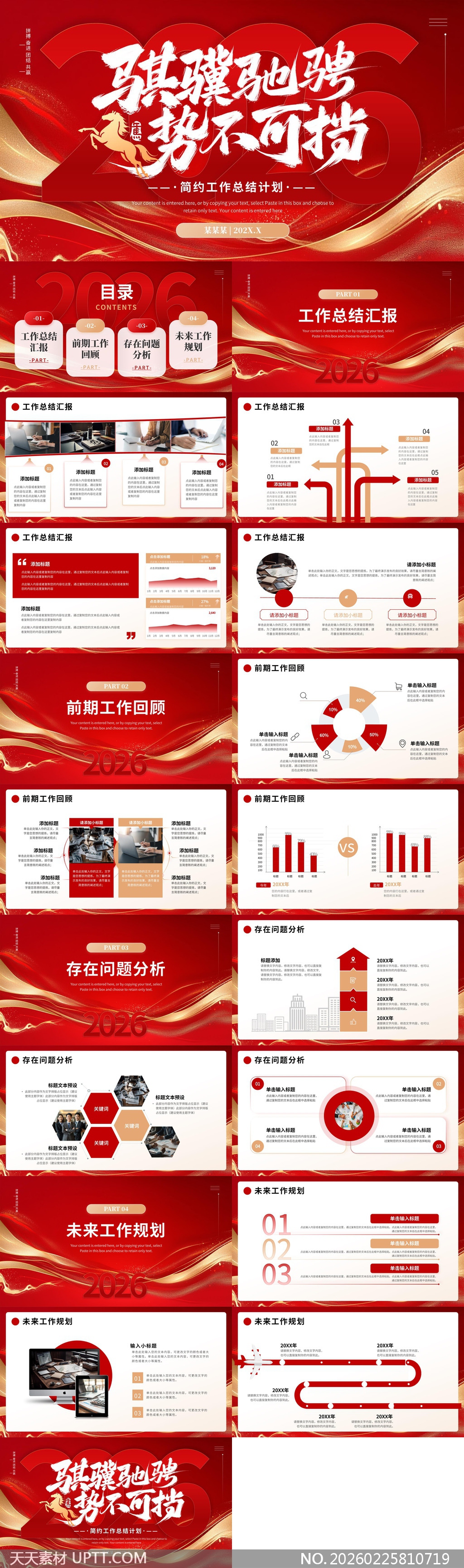本模板采用高饱和度红色基底搭配鎏金纹理与流动光效,营造出庄重热烈又不失现代感的视觉氛围,主标题“骐骥驰骋 势不可挡”以书法笔触强化气势,划分为工作总结、前期回顾、问题分析与未来规划四大模块,适配企业年度述职、部门复盘、战略发布会等正式场合,兼顾专业性与感染力,助力用户高效呈现2026年度成果与前瞻布局。【 素材唯一编号 20260225810719 】,述职汇报类红色风格PPTX格式素材下载,文件格式为.PPTX,下载完成后的文件为一个压缩包,素材压缩包大小6.43 MB,请解压后用相应软件打开。