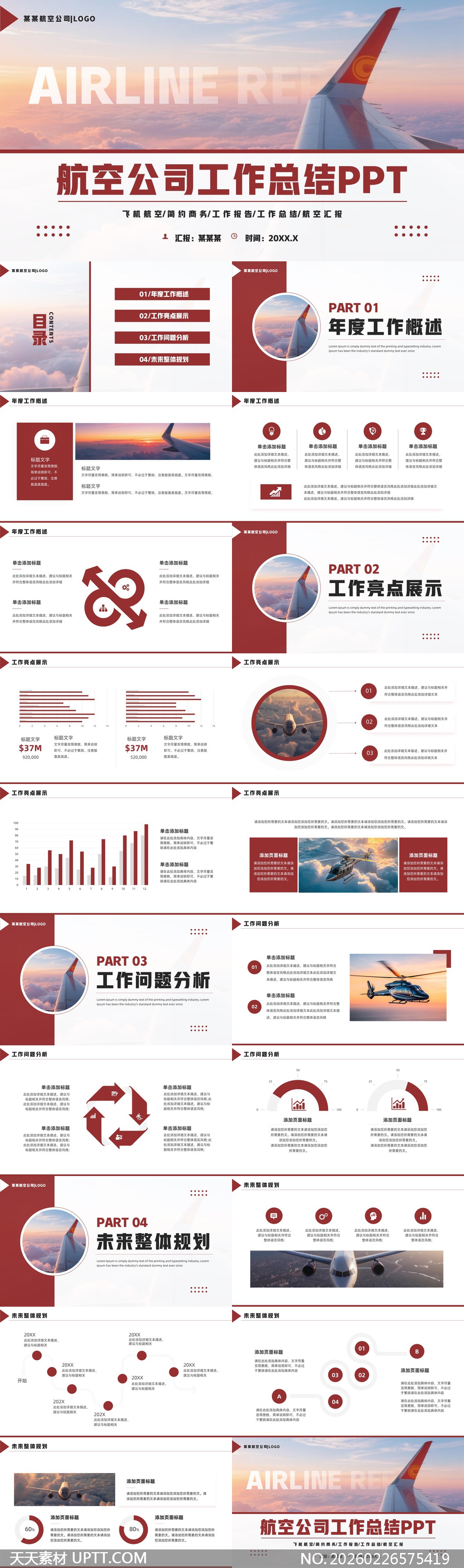 本PPT模板专为航空业年度复盘与战略部署打造,采用沉稳酒红与天空蓝主色调,融合机翼、云层、航拍实景等专业视觉元素,提升行业辨识度;分为工作概述、亮点成果、问题诊断与未来规划四大模块,适用于航空公司内部述职汇报、管理层年度会议、行业交流展示等场景,兼顾专业性与视觉表现力,助力高效呈现运营成效与战略蓝图。【 素材唯一编号 20260226575419 】,工作总结类红色风格PPTX格式素材下载,文件格式为.PPTX,下载完成后的文件为一个压缩包,素材压缩包大小13.06 MB,请解压后用相应软件打开。