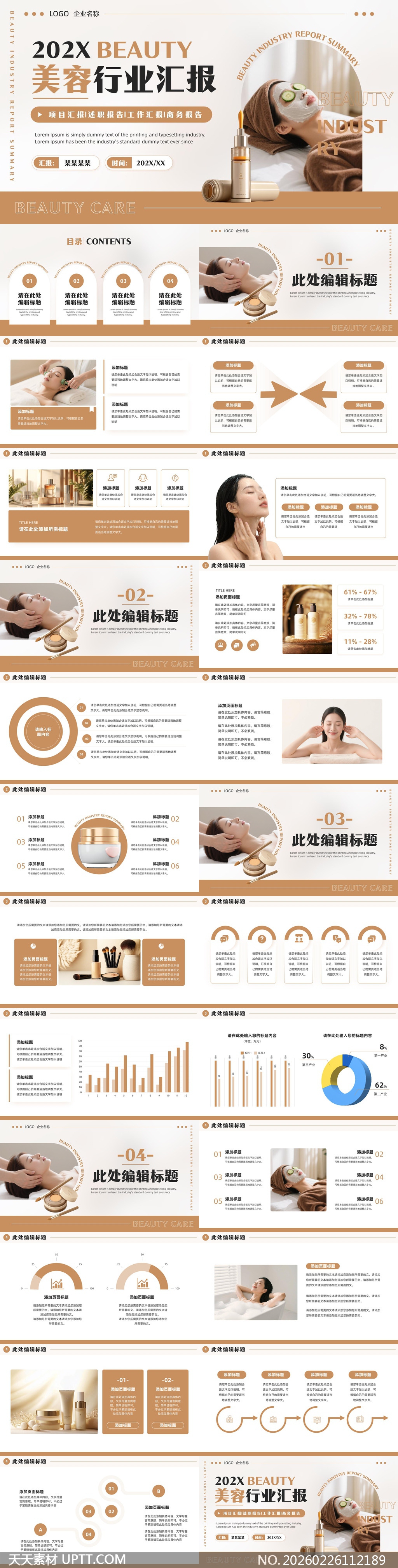本PPT模板专为美容行业量身打造,采用柔和米棕配色与高清实景图(如面膜护理、产品特写、SPA场景),营造专业又温馨的视觉氛围;适用于年度总结、项目复盘、述职汇报及商务提案等场景,兼顾美学表达与信息传达效率,助力品牌方或机构清晰呈现业绩成果、市场分析与战略规划,提升汇报专业度与客户信任感。【 素材唯一编号 20260226112189 】,述职汇报类黄色风格PPTX格式素材下载,文件格式为.PPTX,下载完成后的文件为一个压缩包,素材压缩包大小19.64 MB,请解压后用相应软件打开。