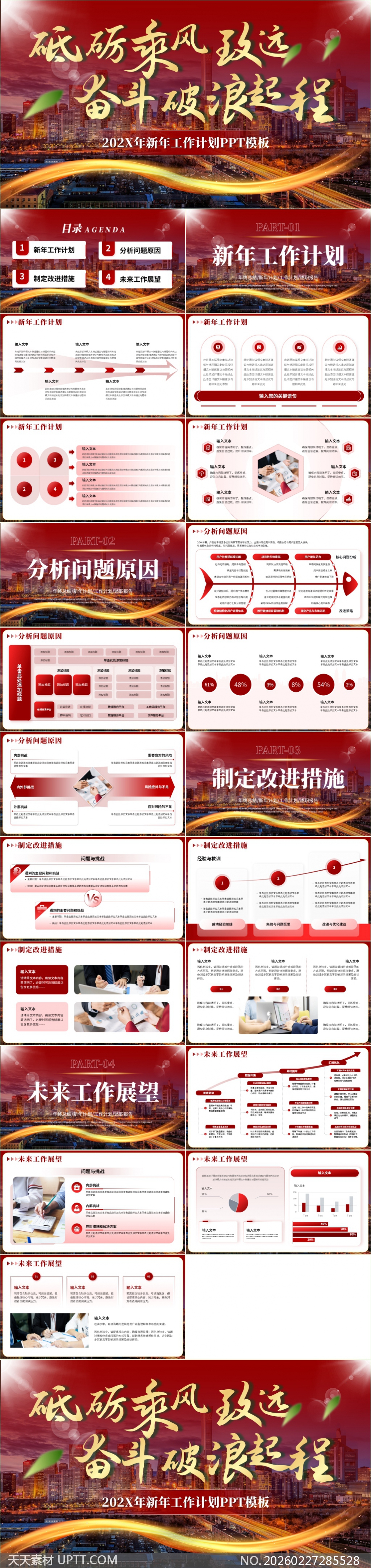 本PPT模板以恢弘城市夜景与金色光轨为视觉基调,融合庄重红色主调与动态流线设计,营造出昂扬奋进的仪式感;划分为工作计划、问题分析、改进措施与未来展望四大模块,适用于政府机关、国企单位及大型企业的新年战略部署会、年度总结汇报与目标动员大会,兼具政治高度与实操性,助力高效传达规划思路与执行路径。【 素材唯一编号 20260227285528 】,述职汇报类红色风格PPTX格式素材下载,文件格式为.PPTX,下载完成后的文件为一个压缩包,素材压缩包大小7.35 MB,请解压后用相应软件打开。