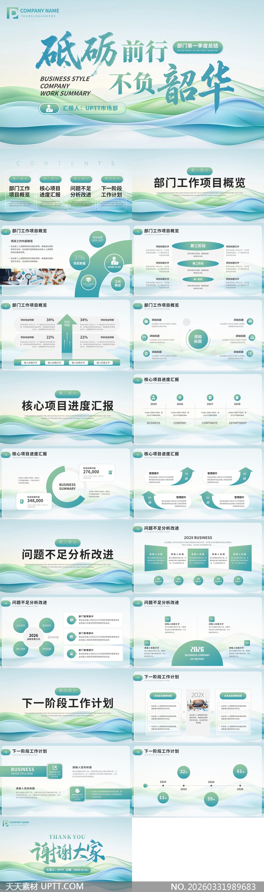 本模板采用清新蓝绿渐变流体设计,营造出轻盈通透的视觉氛围,搭配手写艺术字标题与模块化布局,内含部门概览、项目进度、问题分析与下阶段计划四大核心板块,适用于企业季度复盘、团队述职、战略规划等正式汇报场景,助力高效制作兼具逻辑清晰与视觉吸引力的工作总结演示文稿。【 素材唯一编号 20260331989683 】,述职汇报类蓝色风格PPTX格式素材下载,文件格式为.PPTX,下载完成后的文件为一个压缩包,素材压缩包大小2.21 MB,请解压后用相应软件打开。