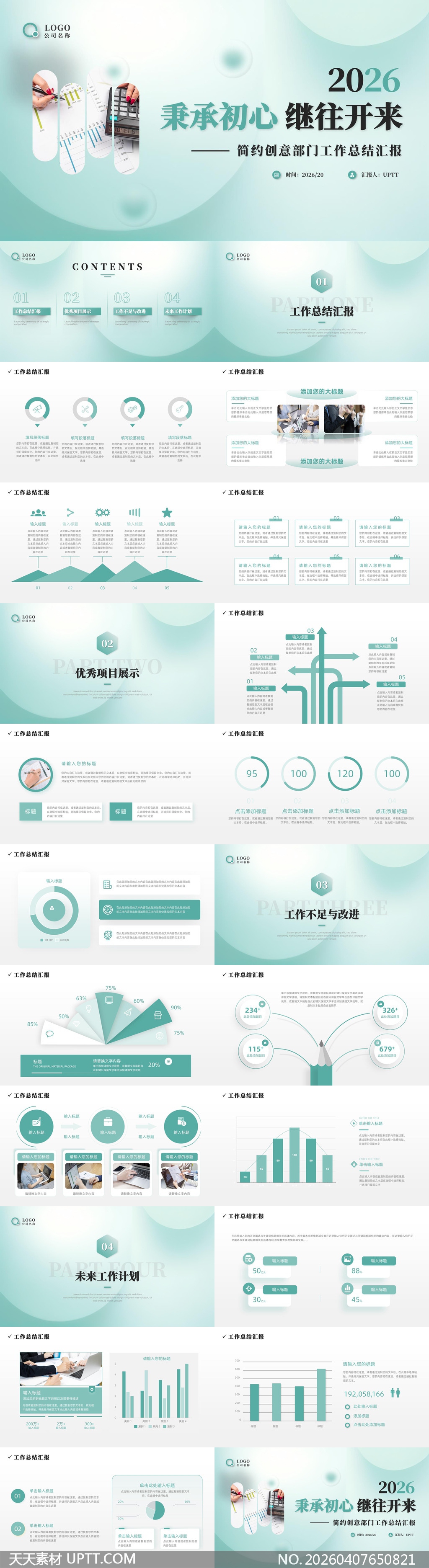 本模板采用低饱和度青绿色系搭配柔美渐变与留白设计,内含工作汇报、项目展示、问题分析与未来规划四大核心模块,适用于创意、设计、市场等轻资产部门的季度/年度总结、项目复盘及战略提案场景,兼顾逻辑清晰性与审美现代感,助力高效呈现成果与思考。【 素材唯一编号 20260407650821 】,工作总结类绿色风格PPTX格式素材下载,文件格式为.PPTX,下载完成后的文件为一个压缩包,素材压缩包大小40.7 MB,请解压后用相应软件打开。