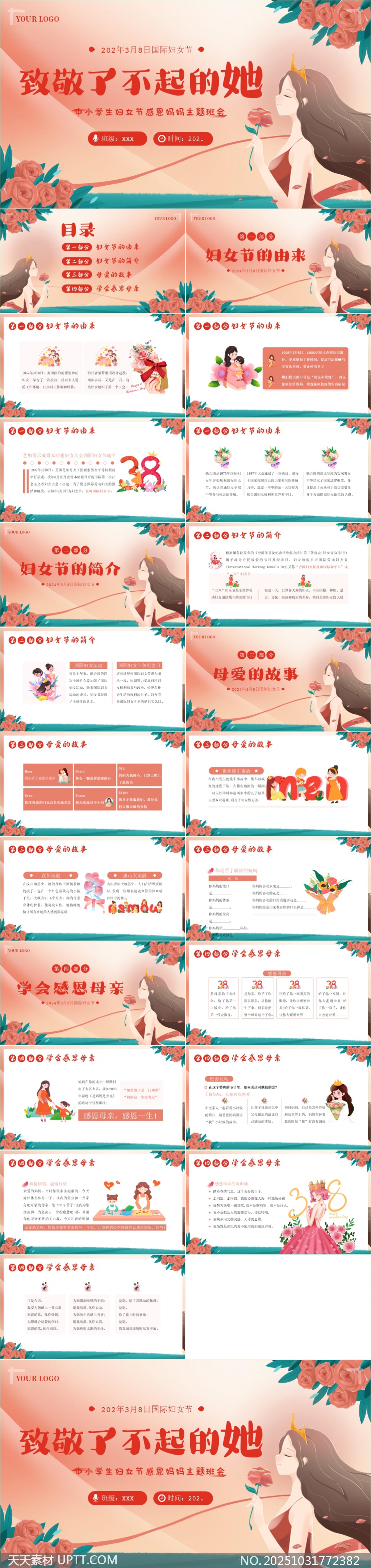 本PPT模板以温柔浪漫的粉色玫瑰为主题色调,融合梦幻插画与精致排版,展现女性柔美与母爱光辉,适用于中小学妇女节、感恩母亲主题班会活动。内容涵盖节日由来、母爱故事、感恩实践等板块,结构清晰,互动性强,配合温馨字体与装饰元素,营造温暖感人氛围,助力教师轻松开展情感教育课程,传递敬意与温情。【 素材唯一编号 20251031772382 】,卡通类红色风格PPTX格式素材下载,文件格式为.PPTX,下载完成后的文件为一个压缩包,素材压缩包大小19.71 MB,请解压后用相应软件打开。