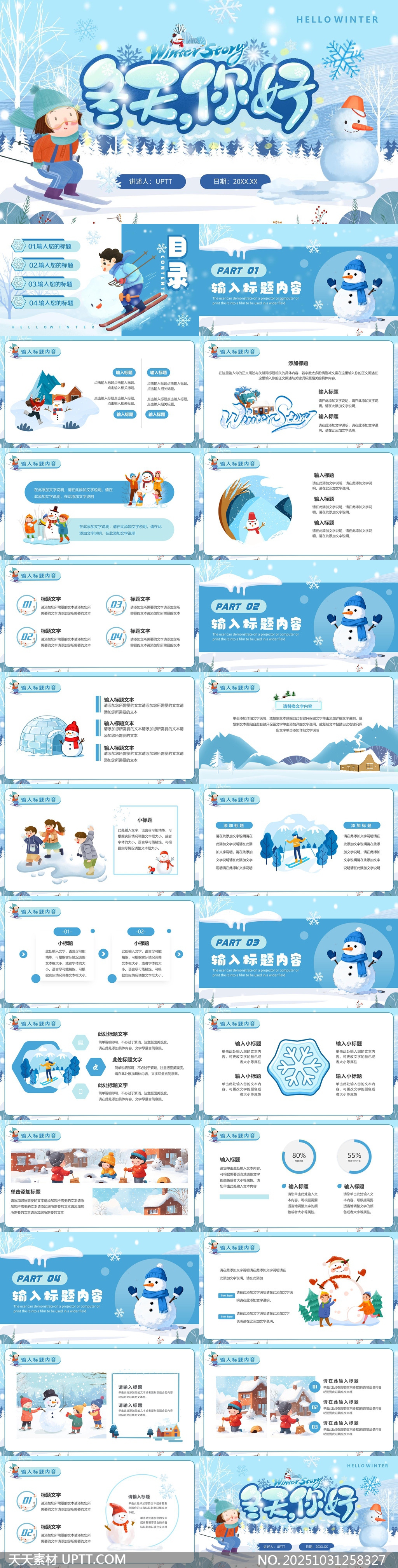 本PPT模板以清新可爱的冬季卡通风格为主题,融入雪人、滑雪人物、雪屋等元素,搭配蓝色渐变背景与雪花点缀,营造出温馨活泼的冬日氛围。适用于儿童教育、节日活动、冬季主题汇报等多种场景,轻松提升演示趣味性与视觉吸引力。【 素材唯一编号 20251031258327 】,卡通类蓝色风格PPTX格式素材下载,文件格式为.PPTX,下载完成后的文件为一个压缩包,素材压缩包大小23.44 MB,请解压后用相应软件打开。