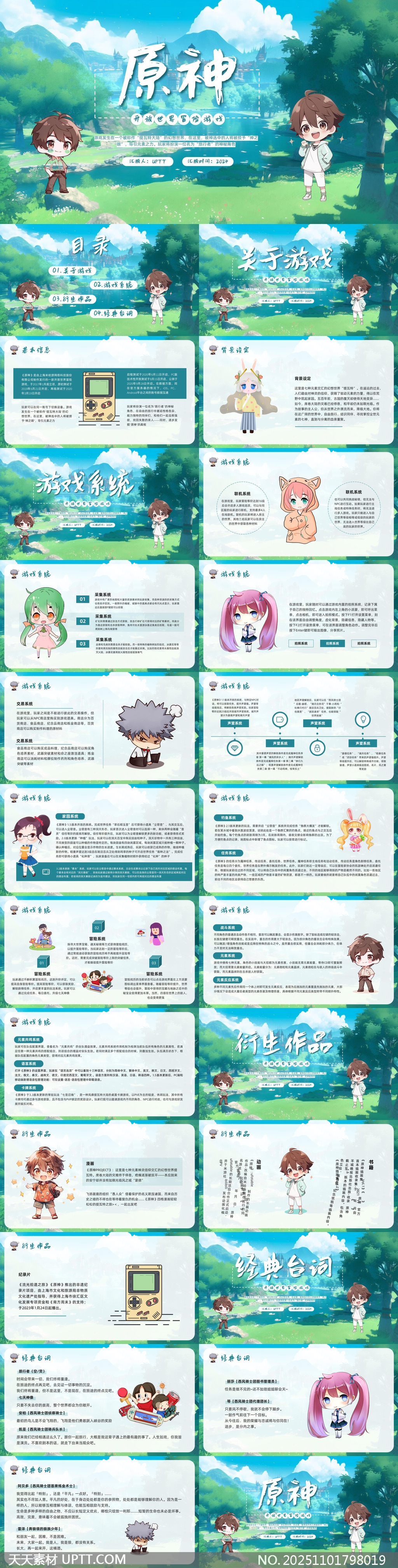 本PPT模板以《原神》为主题,采用清新治愈的二次元风格设计,融合游戏世界观与角色元素,整体配色明亮柔和,视觉层次分明,搭配Q版角色插画与动态图标,增强趣味性与代入感。适用于游戏介绍、角色设定展示、校园社团活动或游戏爱好者分享会等场景,内容结构清晰,涵盖游戏背景、系统机制、衍生作品及经典台词,兼具实用性与审美价值,助力用户高效呈现精彩内容。【 素材唯一编号 20251101798019 】,卡通类绿色风格PPTX格式素材下载,文件格式为.PPTX,下载完成后的文件为一个压缩包,素材压缩包大小16.68 MB,请解压后用相应软件打开。