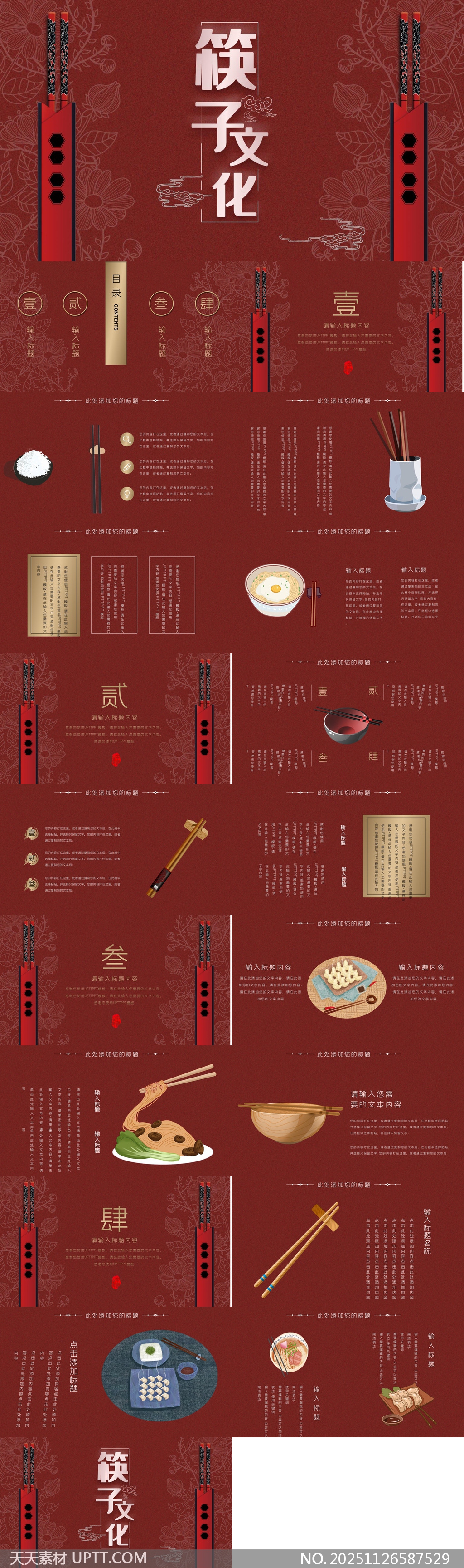 本PPT模板以中式筷子文化为核心设计灵感,融合传统红木色调与精致花卉纹样,搭配经典筷子元素与美食插图,展现浓厚的东方美学韵味。整体布局典雅大气,图文排版清晰有序,适用于文化讲座、餐饮品牌宣传、传统文化教育等场景,既能传递中华饮食礼仪精髓,又兼具视觉美感与实用功能,助力演讲内容更具感染力与文化深度。【 素材唯一编号 20251126587529 】,中国风类红色风格PPTX格式素材下载,文件格式为.PPTX,下载完成后的文件为一个压缩包,素材压缩包大小26.59 MB,请解压后用相应软件打开。