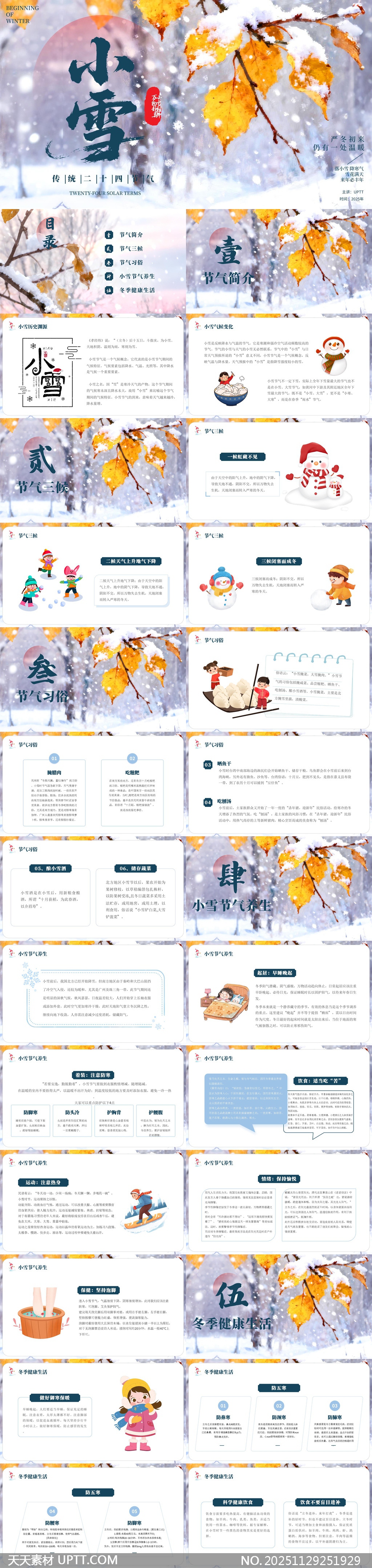 本PPT模板以小雪节气为主题,融合传统文化与现代设计,采用清新雅致的冬日元素与温暖配色,生动呈现节气知识、习俗活动及养生建议,搭配可爱插画与清晰排版,适合学校教学、文化讲座、节日宣传等场景使用,帮助用户轻松传达节气内涵,营造浓厚的文化氛围。【 素材唯一编号 20251129251929 】,中国风类彩色风格PPTX格式素材下载,文件格式为.PPTX,下载完成后的文件为一个压缩包,素材压缩包大小58.84 MB,请解压后用相应软件打开。