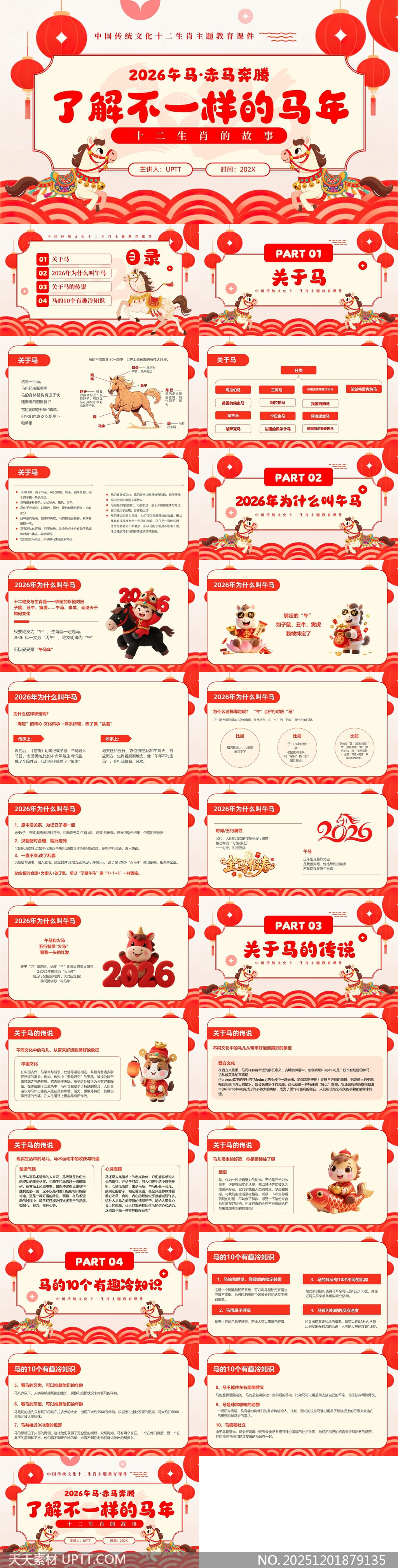 本PPT模板以2026年马年为主题,融合中国传统生肖文化与现代设计元素,生动呈现马的起源、传说及趣味冷知识,适合学校传统文化课堂、节日庆典活动或企业年会使用,助力用户轻松打造富有文化内涵的演示作品。【 素材唯一编号 20251201879135 】,企业培训类红色风格PPTX格式素材下载,文件格式为.PPTX,下载完成后的文件为一个压缩包,素材压缩包大小13.86 MB,请解压后用相应软件打开。