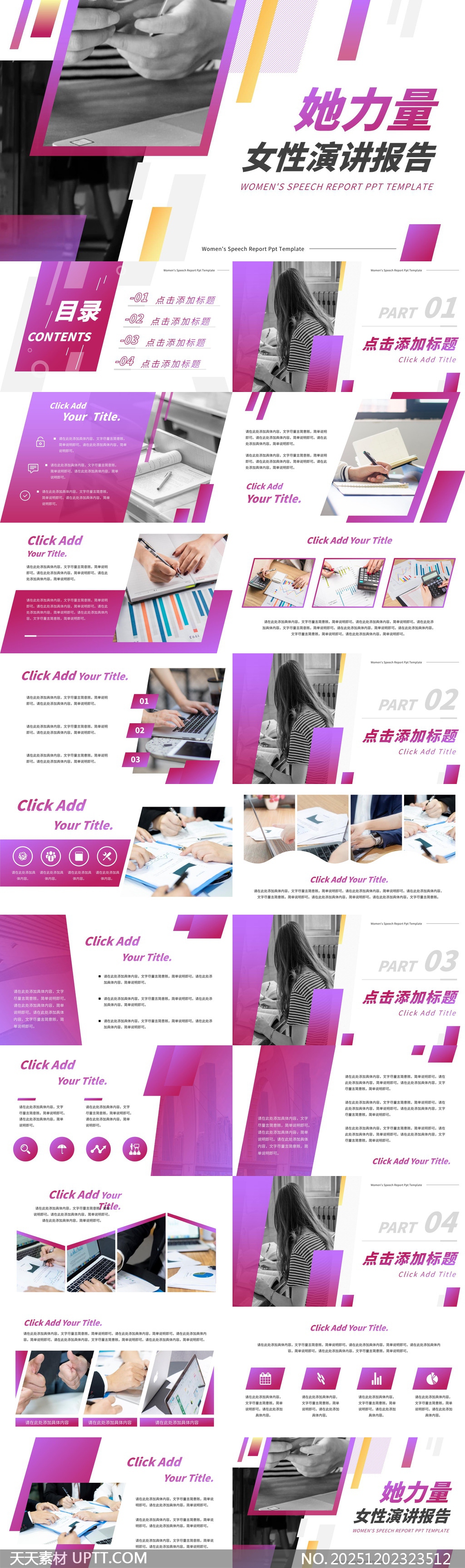 这款“她力量”女性演讲报告PPT模板以紫色为主色调,展现女性自信、专业与优雅的气质,适用于女性职场演讲、个人成长分享、女性领导力论坛等场景。模板结构清晰。【 素材唯一编号 20251202323512 】,简约类紫色风格PPTX格式素材下载,文件格式为.PPTX,下载完成后的文件为一个压缩包,素材压缩包大小17.62 MB,请解压后用相应软件打开。