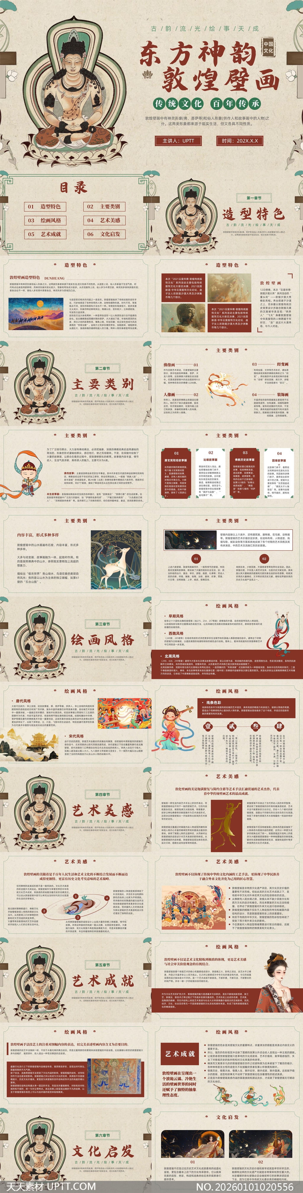 本PPT模板深度还原敦煌壁画的东方神韵,融合飞天、佛像、经变画等经典元素,以古朴配色与传统纹样构建沉浸式文化场景,内容涵盖造型特色、绘画风格、艺术美感及文化启发六大章节,适用于传统文化讲座、艺术鉴赏课、博物馆导览或国风主题汇报,是传递千年丝路美学与中华文明精神的视觉利器。【 素材唯一编号 20260101020556 】,中国风类黄色风格PPTX格式素材下载,文件格式为.PPTX,下载完成后的文件为一个压缩包,素材压缩包大小20.46 MB,请解压后用相应软件打开。