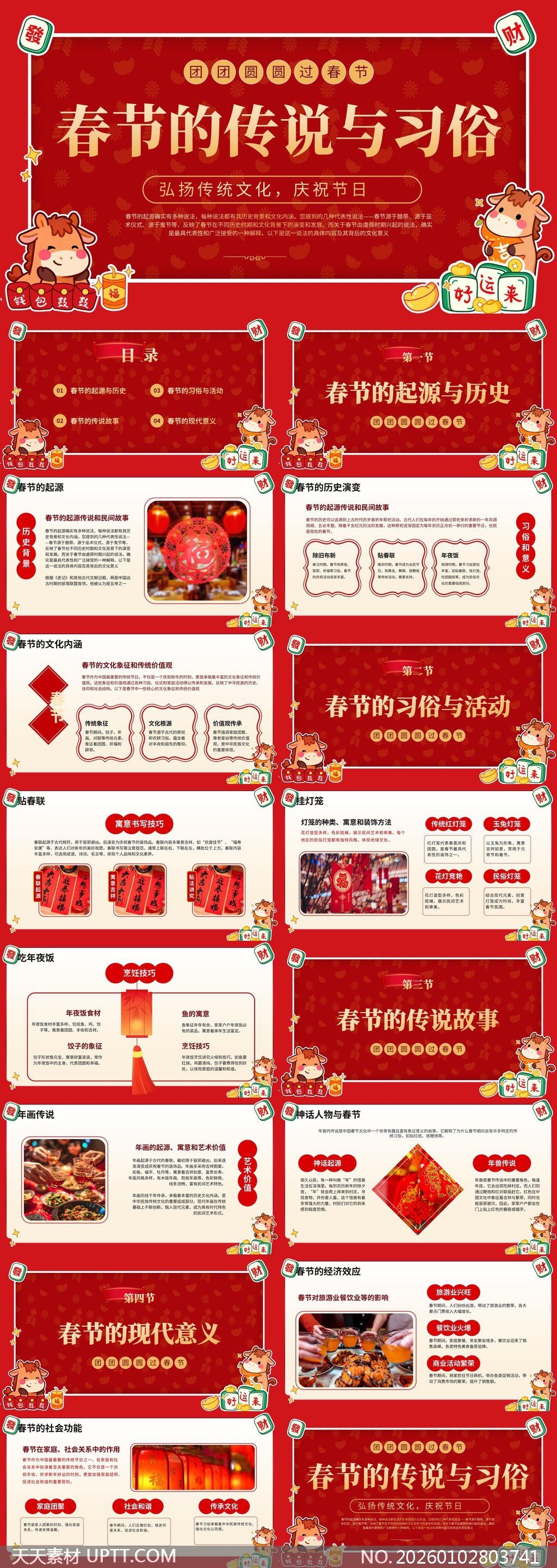 这款PPT模板以喜庆红金为主色调,搭配萌趣牛年IP与传统剪纸、灯笼等元素,视觉冲击力强且文化氛围浓厚;内容结构清晰涵盖起源、习俗、传说及现代意义四大模块,适用于学校传统文化课、企业年会文化分享、社区节庆宣讲等场景,是传播春节文化内涵、提升节日仪式感的理想演示工具。【 素材唯一编号 20260102803741 】,喜庆类红色风格PPTX格式素材下载,文件格式为.PPTX,下载完成后的文件为一个压缩包,素材压缩包大小7.07 MB,请解压后用相应软件打开。