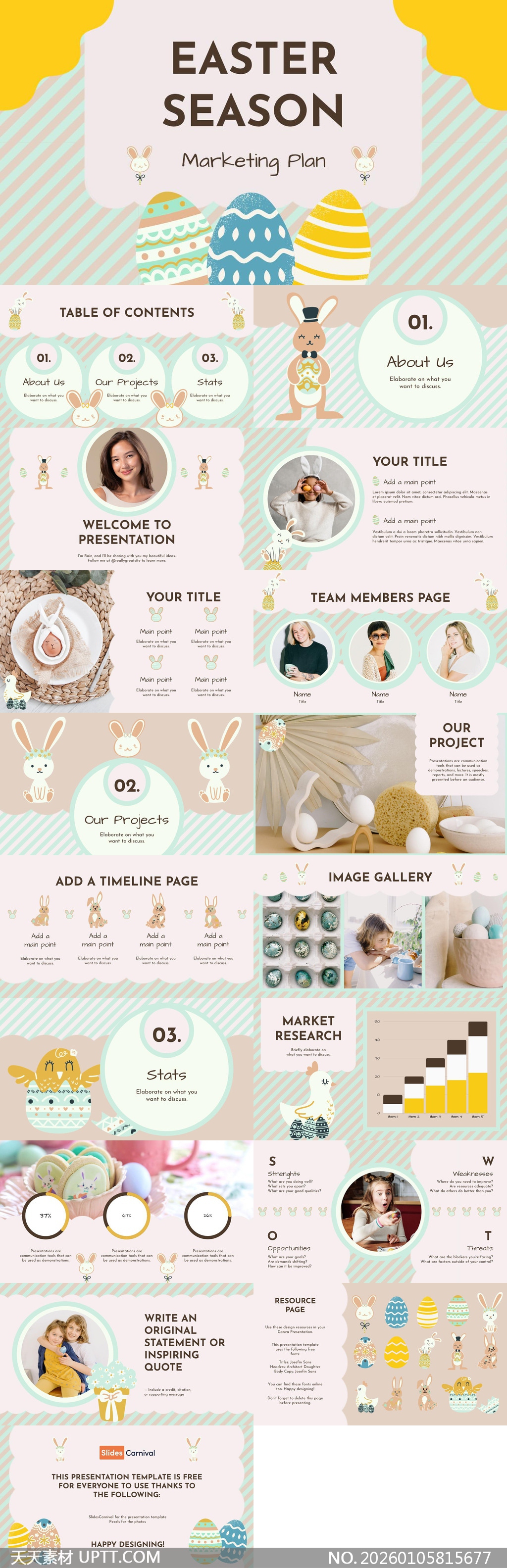 这款PPT模板以复活节为灵感,采用清新马卡龙配色与萌趣卡通兔、彩蛋元素,营造温馨节日氛围,内置团队介绍、项目规划、数据图表及时间轴等完整营销模块,适用于品牌节日促销方案汇报、电商活动策划或儿童教育机构宣传,设计风格活泼不失专业,能快速提升演示视觉吸引力并强化受众情感共鸣。【 素材唯一编号 20260105815677 】,卡通类黄色风格PPTX格式素材下载,文件格式为.PPTX,下载完成后的文件为一个压缩包,素材压缩包大小29.73 MB,请解压后用相应软件打开。