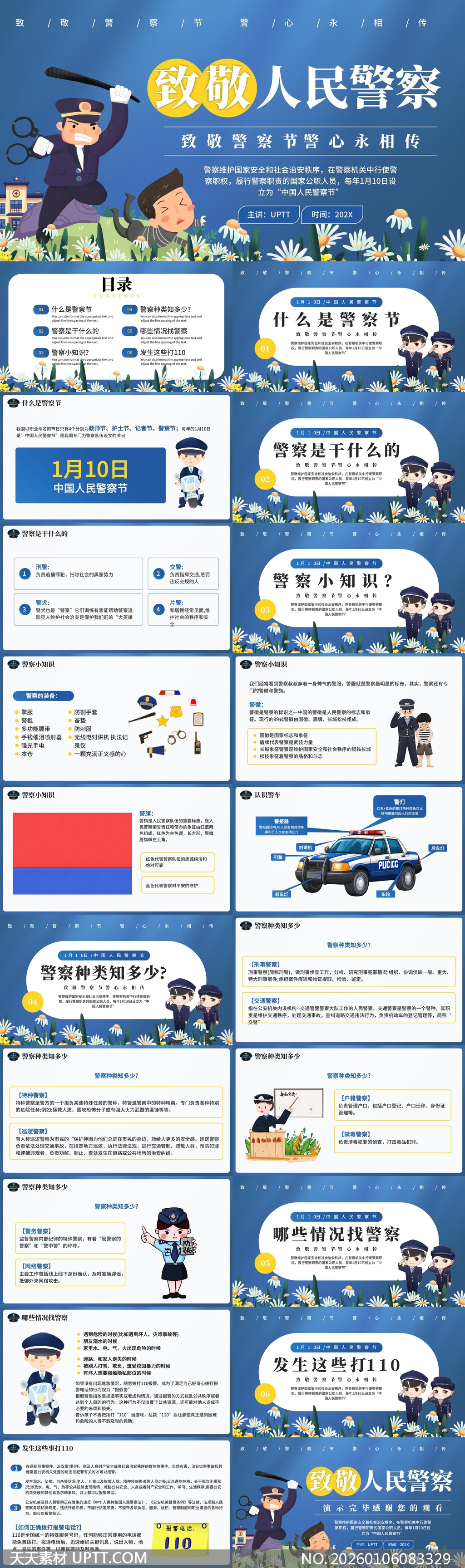 本PPT模板以深蓝主色调搭配清新雏菊边框,融合Q版警员插画与清晰信息图示,生动科普警察节由来、警种职能、装备常识及报警指南,风格庄重又不失亲和力,适用于公安系统内部培训、校园安全教育、社区普法宣传及节日主题汇报等场景,助力传递警民鱼水情与职业荣誉感。【 素材唯一编号 20260106083329 】,插画类蓝色风格PPTX格式素材下载,文件格式为.PPTX,下载完成后的文件为一个压缩包,素材压缩包大小11.93 MB,请解压后用相应软件打开。