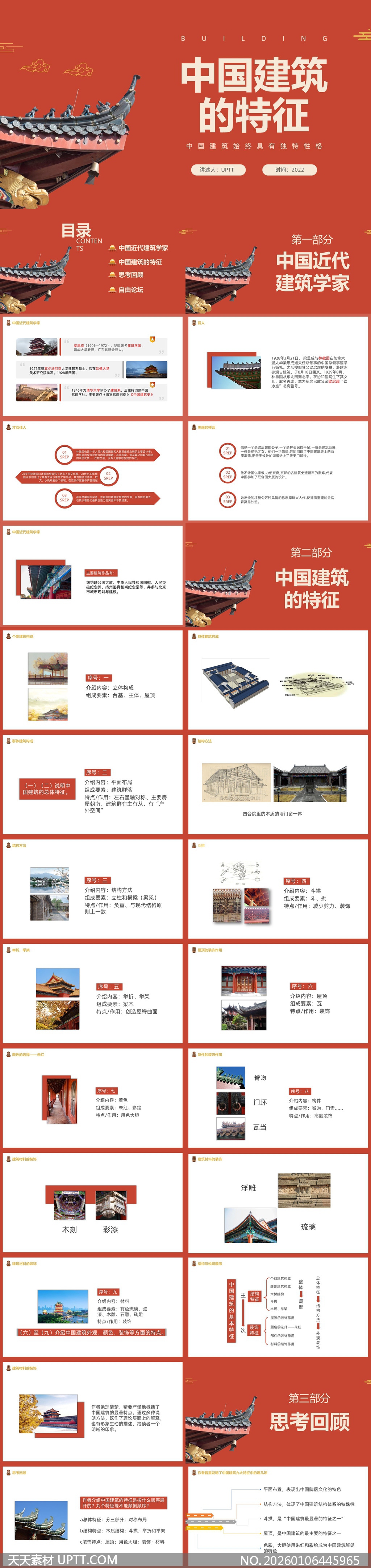本PPT模板以浓郁中国红为基调,融合飞檐斗拱、朱漆彩绘等传统建筑元素,系统梳理梁思成等近代建筑大师生平与贡献,并深入解析木构体系、平面布局、装饰工艺等九大建筑特征,适用于高校建筑史课程、文化讲座及博物馆导览等场景,助力用户高效传递东方营造智慧与人文精神。【 素材唯一编号 20260106445965 】,中国风类红色风格PPTX格式素材下载,文件格式为.PPTX,下载完成后的文件为一个压缩包,素材压缩包大小12.98 MB,请解压后用相应软件打开。