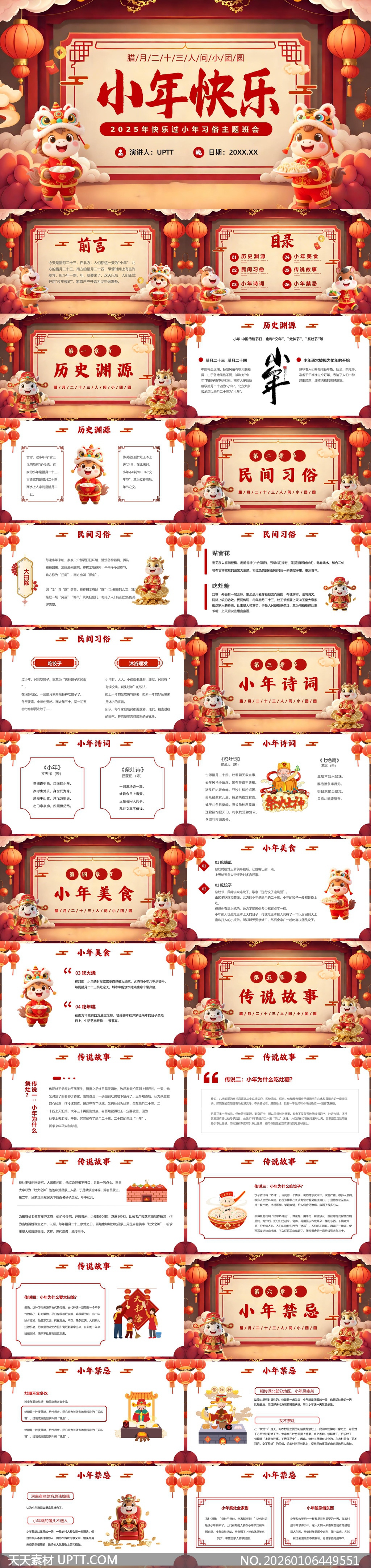 这款PPT模板以2025小年为主题,内容涵盖历史渊源、民俗活动、诗词美食与传说故事,非常适合中小学主题班会、文化课教学或社区节日宣传使用,既能生动传递传统文化内涵,又能激发学生兴趣,是节庆教育与视觉呈现的完美结合。【 素材唯一编号 20260106449551 】,喜庆类红色风格PPTX格式素材下载,文件格式为.PPTX,下载完成后的文件为一个压缩包,素材压缩包大小20.82 MB,请解压后用相应软件打开。