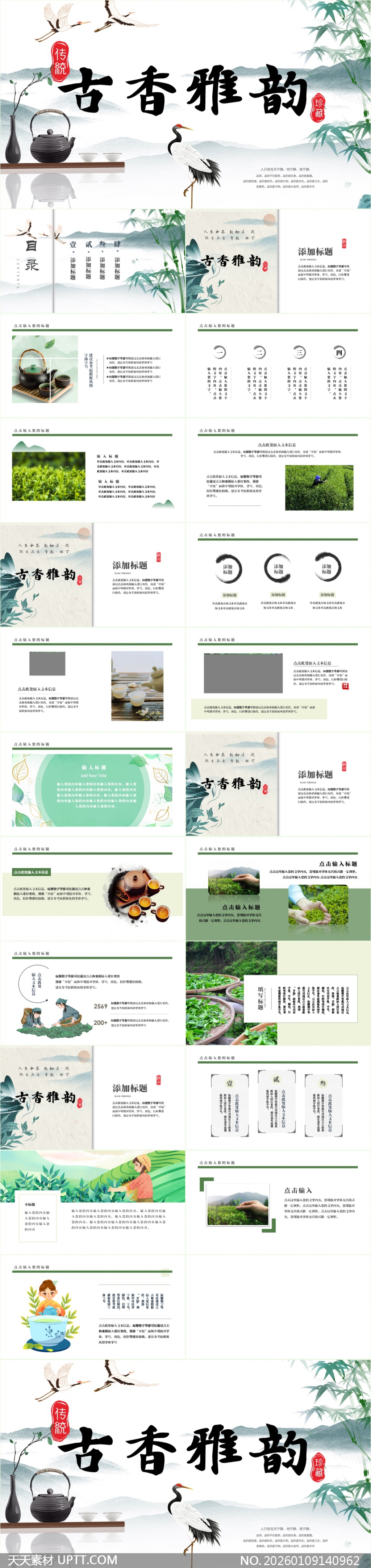 本模板以水墨丹青与雅致茶器为视觉核心,融合仙鹤、竹影、茶园等东方意象,营造静谧悠远的古典美学氛围;既可承载茶道文化讲解、茶叶品牌推广,亦适用于传统文化讲座、国风活动策划等场景,助您一键打造富有诗意与格调的专业演示文稿。【 素材唯一编号 20260109140962 】,中国风类绿色风格PPTX格式素材下载,文件格式为.PPTX,下载完成后的文件为一个压缩包,素材压缩包大小41.45 MB,请解压后用相应软件打开。