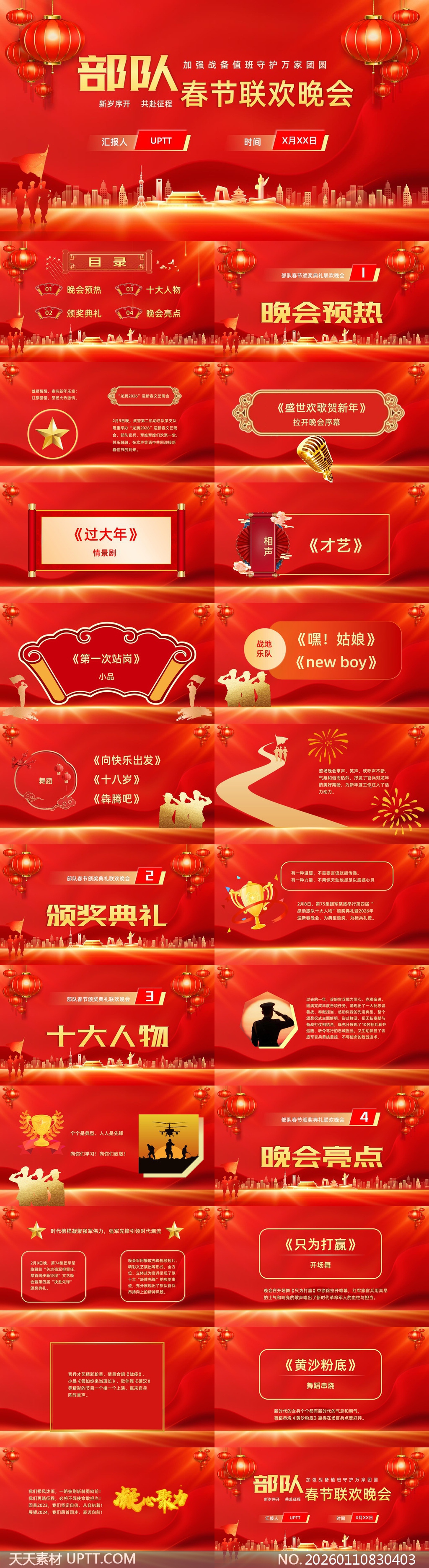 本PPT模板专为部队春节联欢晚会及颁奖典礼打造,采用喜庆中国红主色调,融合灯笼、军徽、城市剪影等元素,营造庄重热烈的节日氛围;结构清晰涵盖预热、节目单、颁奖、十大人物展示及亮点回顾等模块,适用于部队年度庆典、表彰大会或文化汇演策划,助力高效呈现军人风采与新春团聚主题。【 素材唯一编号 20260110830403 】,喜庆类红色风格PPTX格式素材下载,文件格式为.PPTX,下载完成后的文件为一个压缩包,素材压缩包大小20.35 MB,请解压后用相应软件打开。