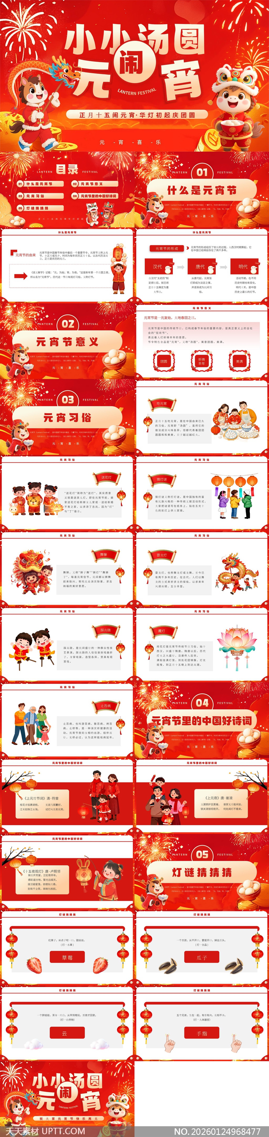 本PPT模板采用活泼可爱的卡通插画风格,以红金主色调营造喜庆祥和的节日氛围,内容涵盖元宵节起源、文化内涵、传统习俗(如吃汤圆、赏花灯、舞龙舞狮、猜灯谜)及经典诗词赏析,每页均融入萌趣角色与民俗元素增强代入感;适用于中小学传统文化教学、社区节日宣讲、企业团建活动或亲子互动课堂,兼具知识性、趣味性与视觉感染力,助力生动传播中华优秀传统节日文化。【 素材唯一编号 20260124968477 】,喜庆类红色风格PPTX格式素材下载,文件格式为.PPTX,下载完成后的文件为一个压缩包,素材压缩包大小74.72 MB,请解压后用相应软件打开。