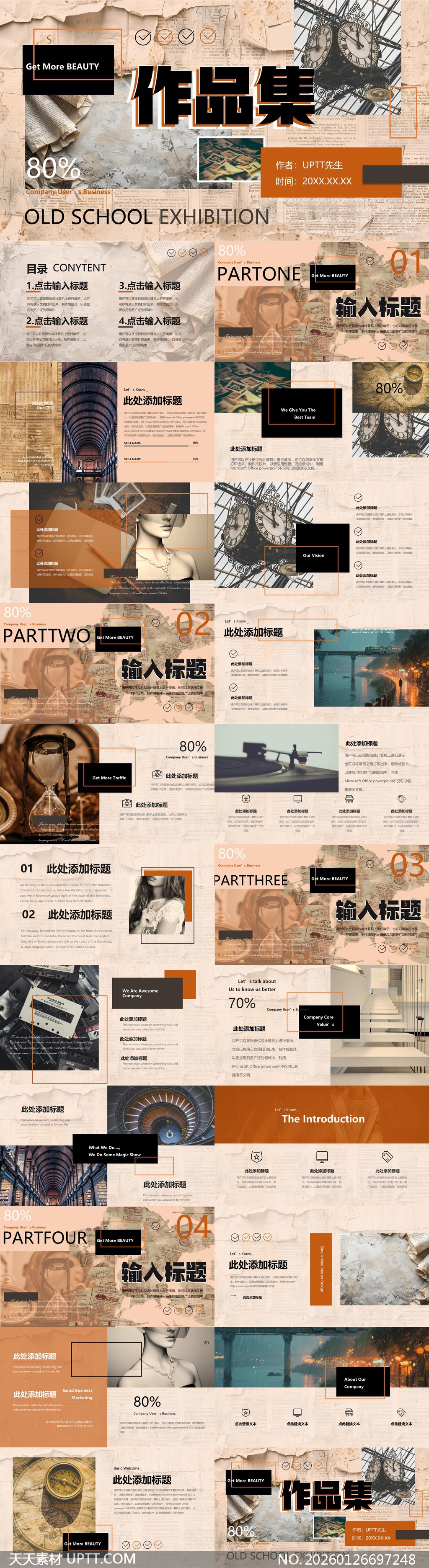 本模板以做旧纸张、老式钟表、胶片相机、磁带与复古印刷纹理为视觉核心,营造浓郁的怀旧文艺氛围,搭配橙黑撞色与手写体标题强化年代感;适用于设计师个人作品集汇报、创意工作室展览提案、高校毕业设计答辩或品牌历史回顾类演示场景,兼顾艺术性与实用性,助您在专业呈现中传递独特叙事温度。【 素材唯一编号 20260126697248 】,复古类黄色风格PPTX格式素材下载,文件格式为.PPTX,下载完成后的文件为一个压缩包,素材压缩包大小34.15 MB,请解压后用相应软件打开。
