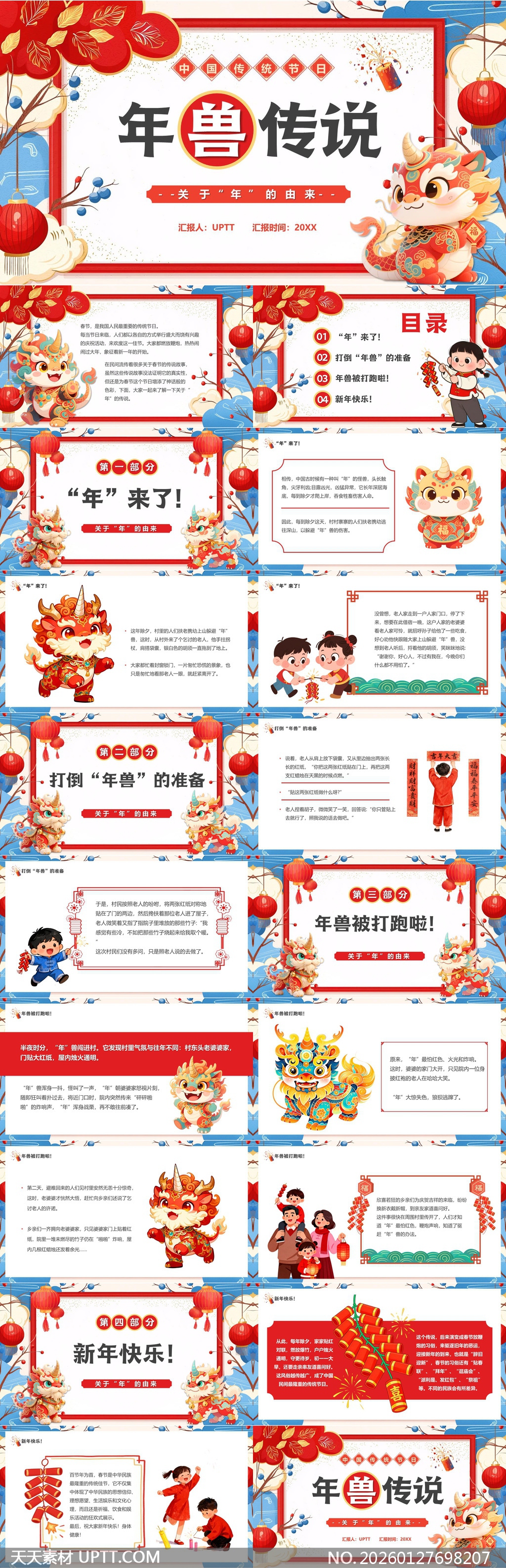 本PPT模板以童趣化、国潮风插画呈现年兽传说,融合红金主色调、灯笼、春联、鞭炮等传统元素与Q版年兽形象,视觉活泼又不失文化韵味;分四部分讲述“年”的由来、驱年准备、击退年兽及新年习俗,配以生动对话与场景还原,适合中小学传统文化课堂、幼儿园节日主题教育、社区文化宣讲及春节主题班会使用,兼具知识性、趣味性与教学实用性,助力轻松传递中华民俗精髓。【 素材唯一编号 20260127698207 】,喜庆类红色风格PPTX格式素材下载,文件格式为.PPTX,下载完成后的文件为一个压缩包,素材压缩包大小20.7 MB,请解压后用相应软件打开。