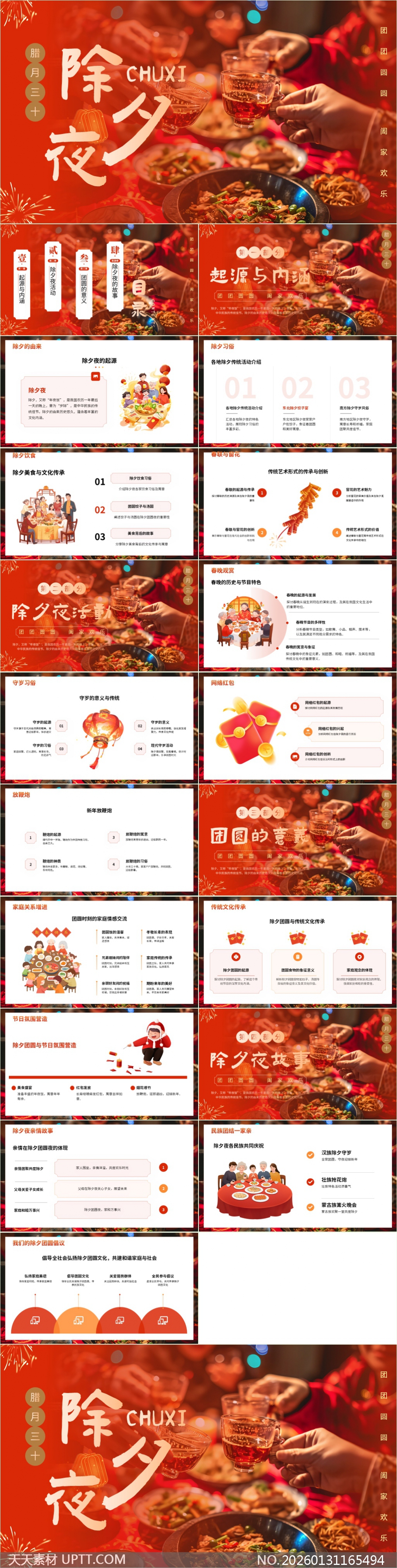 本PPT模板以浓郁中国红为主色调,融合剪纸、灯笼、烟花等传统元素与温馨家庭聚餐实景图,视觉饱满喜庆;结构清晰分为起源内涵、除夕活动、团圆意义与故事讲述四大模块,涵盖守岁、年夜饭、放鞭炮、网络红包等习俗解析及多民族庆祝方式;采用扁平插画与留白排版兼顾专业性与亲和力,适用于中小学传统文化课程教学、社区节日宣讲、企业年会文化分享及家庭教育讲座等场景,助力生动传递除夕文化的深厚底蕴与时代新意。【 素材唯一编号 20260131165494 】,喜庆类红色风格PPTX格式素材下载,文件格式为.PPTX,下载完成后的文件为一个压缩包,素材压缩包大小21.09 MB,请解压后用相应软件打开。