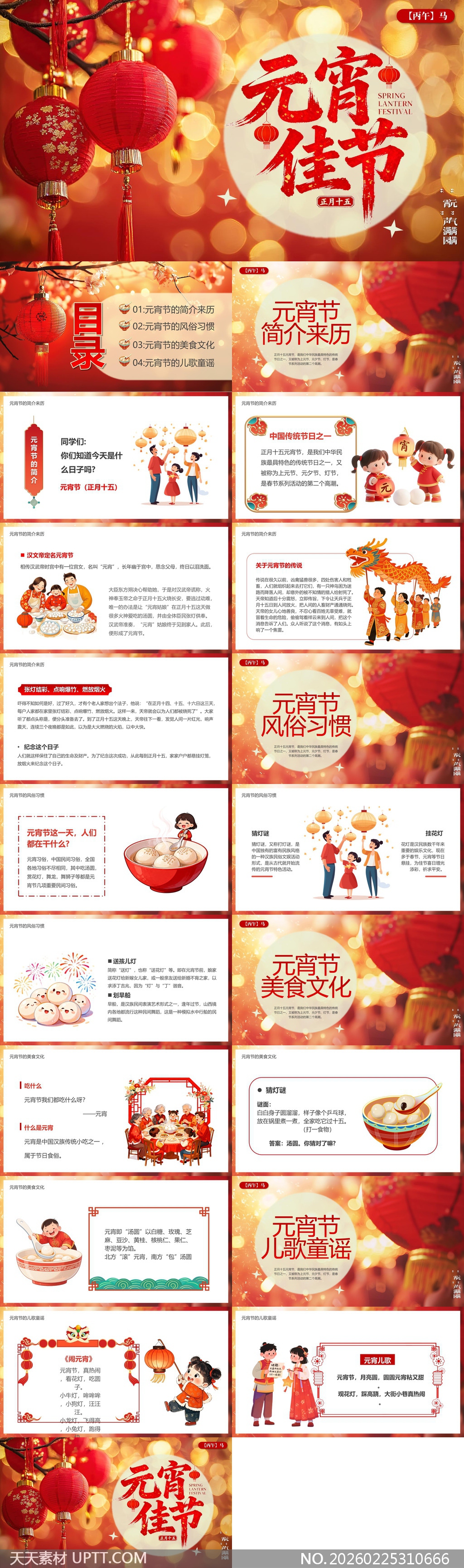 本PPT模板涵盖元宵节起源传说、民俗活动(如猜灯谜、划旱船)、南北美食差异及童趣儿歌,适用于幼儿园节日教学、小学传统文化课堂、社区文化宣讲或企业年会民俗环节,兼具教育性与互动性,助力轻松传递中华节庆文化内涵。【 素材唯一编号 20260225310666 】,喜庆类红色风格PPTX格式素材下载,文件格式为.PPTX,下载完成后的文件为一个压缩包,素材压缩包大小26.75 MB,请解压后用相应软件打开。
