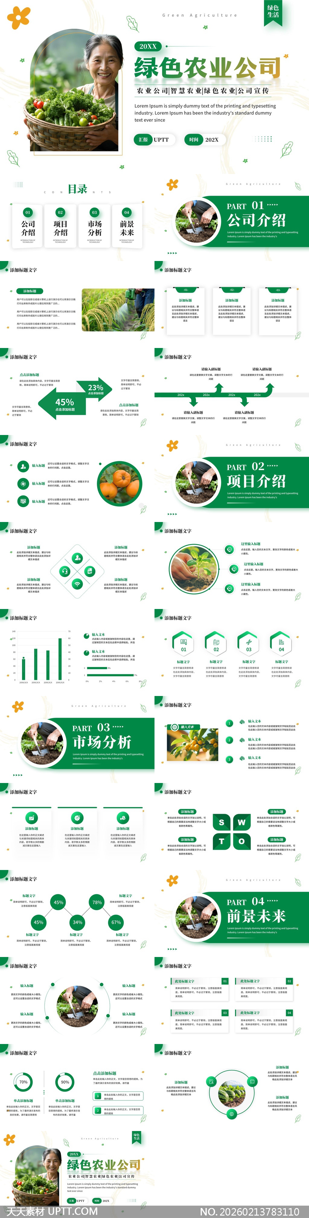 本PPT模板以清新自然的绿色主调搭配手绘植物元素与真实农耕场景图片,营造出专业又富有人文温度的生态农业视觉氛围;内含公司介绍、项目亮点、市场分析及前景展望四大模块,适配农业企业融资路演、政府汇报、招商推介及内部战略规划等多类场景,兼顾信息传达效率与美学表达,助力用户高效呈现绿色可持续发展理念与商业价值。【 素材唯一编号 20260213783110 】,简约类绿色风格PPTX格式素材下载,文件格式为.PPTX,下载完成后的文件为一个压缩包,素材压缩包大小29.11 MB,请解压后用相应软件打开。