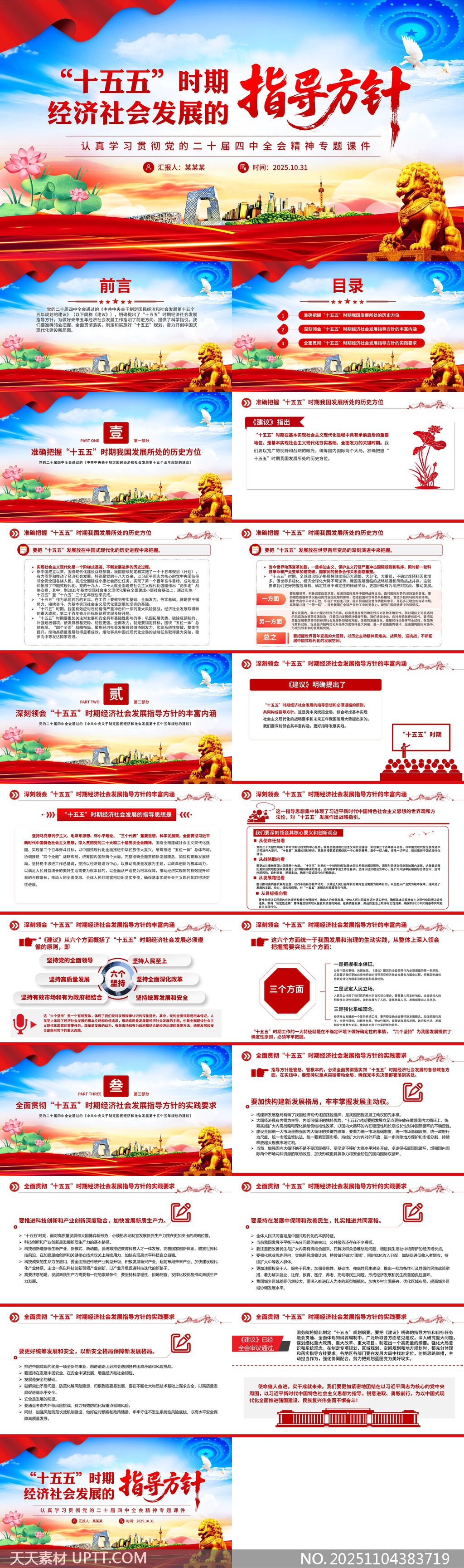 本PPT模板契合政策宣讲主题,适用于党政机关、企事业单位开展“十五五”规划专题学习与党课教育。内容结构清晰,涵盖前言、目录、三大核心板块及实践要求,便于用户快速填充内容进行汇报展示,是高质量政治理论学习材料的理想选择。【 素材唯一编号 20251104383719 】,党建类红色风格PPTX格式素材下载,文件格式为.PPTX,下载完成后的文件为一个压缩包,素材压缩包大小17.46 MB,请解压后用相应软件打开。