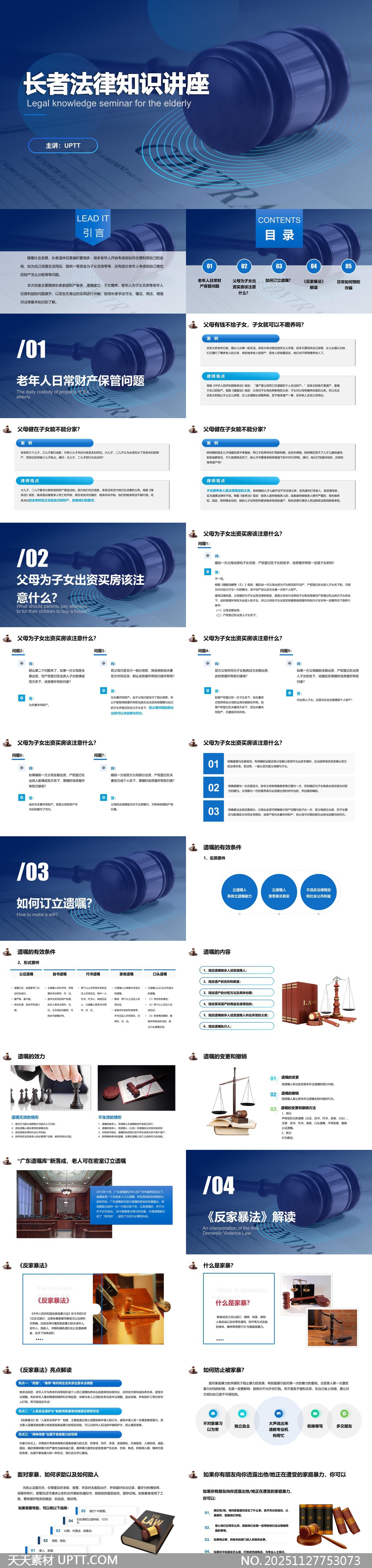 本PPT模板专为长者法律知识普及设计,内容涵盖财产继承、房产出资、遗嘱订立及《反家暴法》解读等实用主题,结合案例分析与法规要点,适合社区、养老机构、公益组织开展普法讲座使用,帮助老年人增强法律意识,维护自身权益。【 素材唯一编号 20251127753073 】,政务类蓝色风格PPTX格式素材下载,文件格式为.PPTX,下载完成后的文件为一个压缩包,素材压缩包大小7.23 MB,请解压后用相应软件打开。