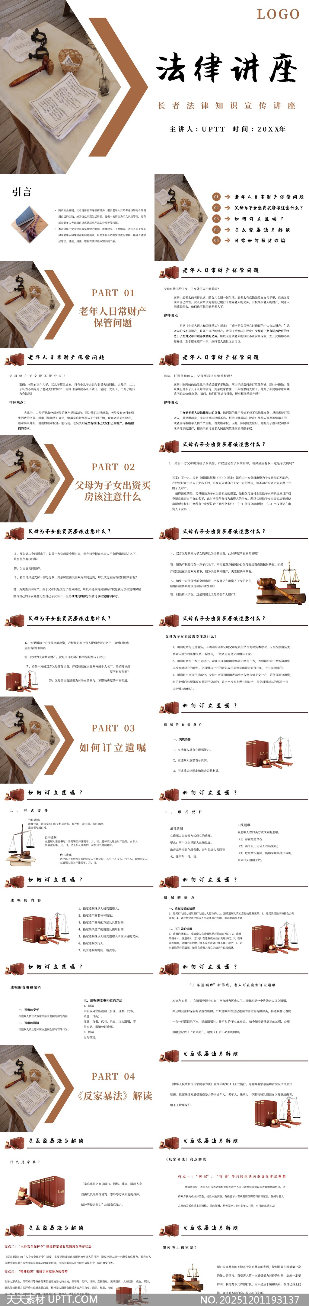 该PPT模板以法律讲座为主题,适用于高校法律课程、社区普法宣传、企业合规培训等场景,内容涵盖老年人财产保管、子女购房出资、遗嘱订立及《反家暴法》解读等热点议题,兼具实用性与视觉美感,助力演讲者高效传达法律知识。【 素材唯一编号 20251201193137 】,政务类彩色风格PPTX格式素材下载,文件格式为.PPTX,下载完成后的文件为一个压缩包,素材压缩包大小15.01 MB,请解压后用相应软件打开。