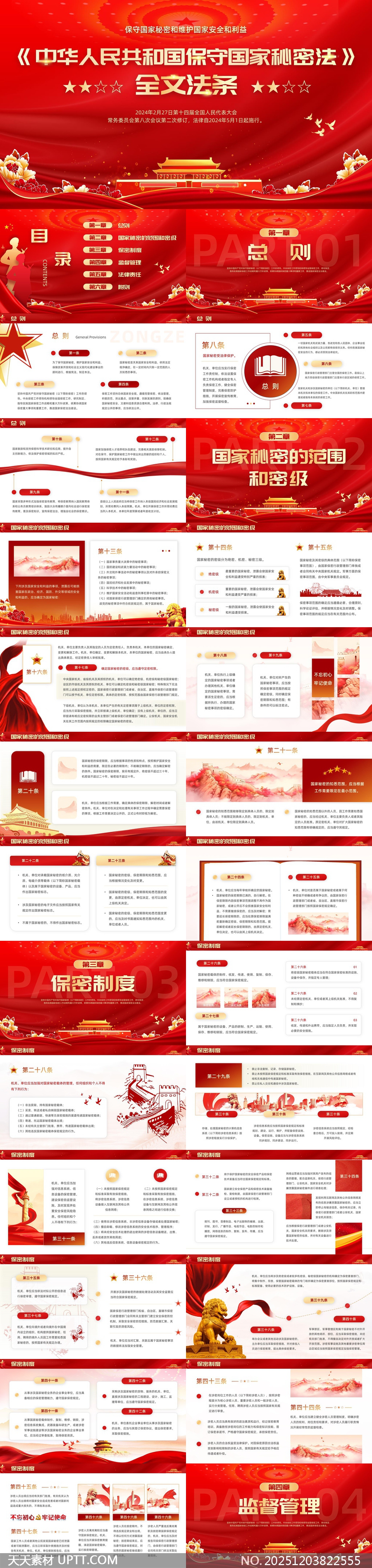 本PPT模板结构清晰完整覆盖《保守国家秘密法》六大章节,每页均配条款原文与图解要点,支持一键替换内容,适用于机关单位保密培训、党校教学、企业合规宣讲等正式场合,助力高效传达法规精神,强化全员保密意识。【 素材唯一编号 20251203822555 】,党建类红色风格PPTX格式素材下载,文件格式为.PPTX,下载完成后的文件为一个压缩包,素材压缩包大小127.51 MB,请解压后用相应软件打开。