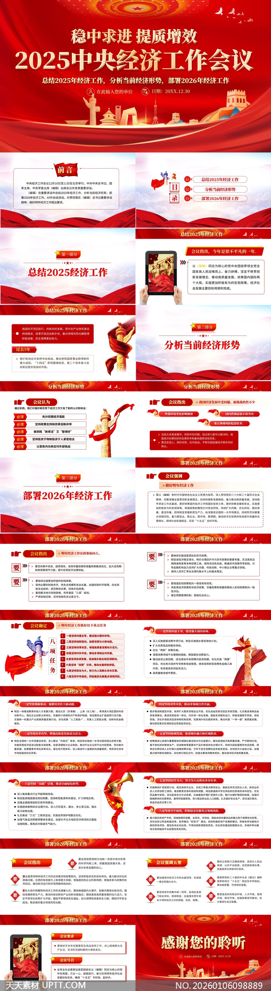 本PPT模板内含“总结—分析—部署”完整逻辑框架,适配政府机关、国企单位年度经济工作会议汇报场景,可高效用于传达政策精神、梳理工作重点与规划未来方向,是提升汇报专业度与视觉感染力的实用工具。【 素材唯一编号 20260106098889 】,党建类红色风格PPTX格式素材下载,文件格式为.PPTX,下载完成后的文件为一个压缩包,素材压缩包大小13 MB,请解压后用相应软件打开。