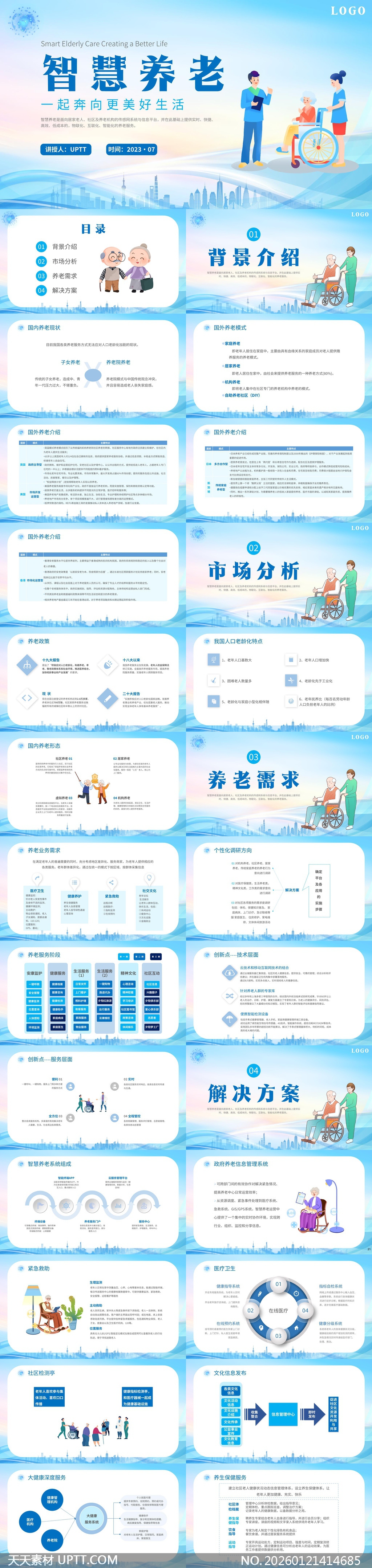 本PPT模板以清新蓝白渐变与城市剪影为视觉基调,融合温馨插画与清晰数据图表,系统呈现智慧养老的背景、市场、需求及解决方案四大模块,适用于政府汇报、企业方案路演、学术研讨等场景,助力用户高效传达科技赋能老龄化社会的核心价值与落地路径。【 素材唯一编号 20260121414685 】,简约类蓝色风格PPTX格式素材下载,文件格式为.PPTX,下载完成后的文件为一个压缩包,素材压缩包大小14.19 MB,请解压后用相应软件打开。