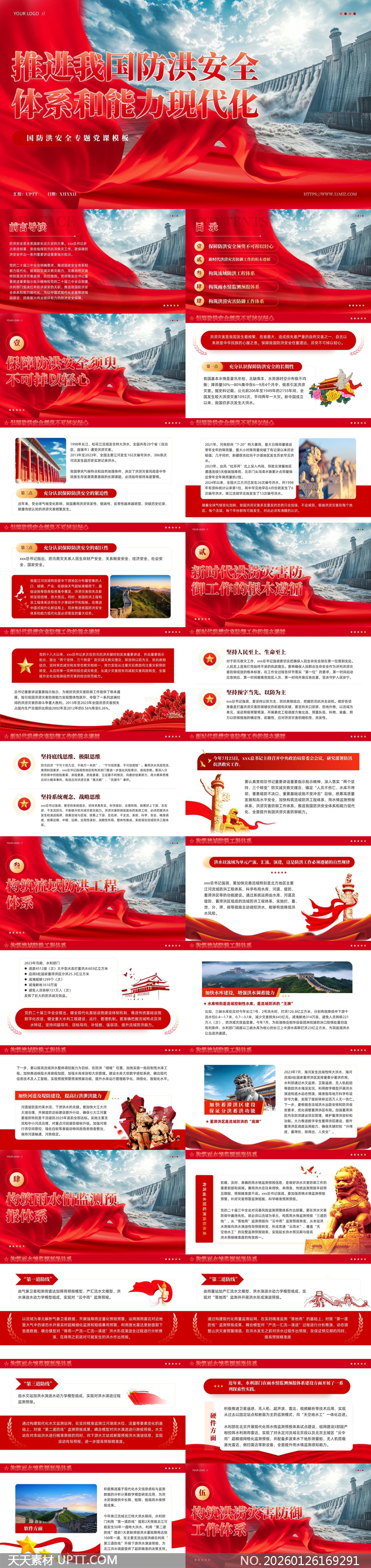 本PPT模板以红金主色调彰显庄重与使命担当,分为五大部分,涵盖安全底线、工程体系、监测预警、应急响应与能力建设,每页均配权威数据、政策引述与可视化图表;适用于党政机关专题党课、水利系统工作汇报、高校思政教学及防灾减灾培训等场景,兼具思想深度与实操价值,助力高效传达国家防洪现代化战略部署与实践路径。【 素材唯一编号 20260126169291 】,党建类红色风格PPTX格式素材下载,文件格式为.PPTX,下载完成后的文件为一个压缩包,素材压缩包大小85.51 MB,请解压后用相应软件打开。