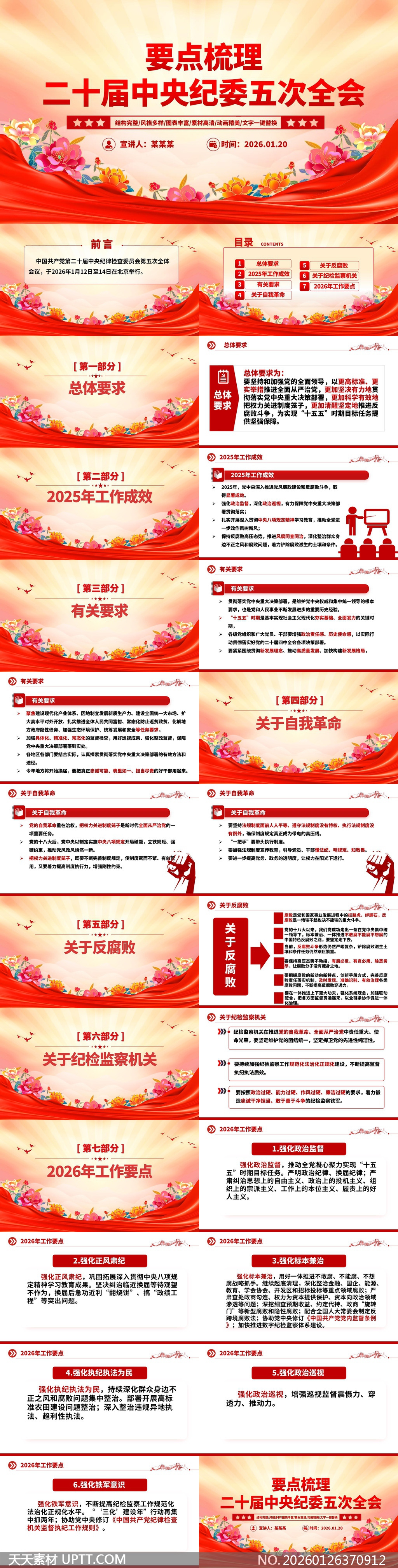 本PPT模板涵盖总体要求、2025年成效、有关要求、自我革命、反腐败、纪检监察机关及2026年工作要点七大模块,适用于党政机关、国企单位开展二十届中央纪委五次全会精神宣贯、专题党课、廉政教育及年度工作部署等正式场合,兼具政治性、专业性与视觉感染力。【 素材唯一编号 20260126370912 】,党建类红色风格PPTX格式素材下载,文件格式为.PPTX,下载完成后的文件为一个压缩包,素材压缩包大小10.4 MB,请解压后用相应软件打开。