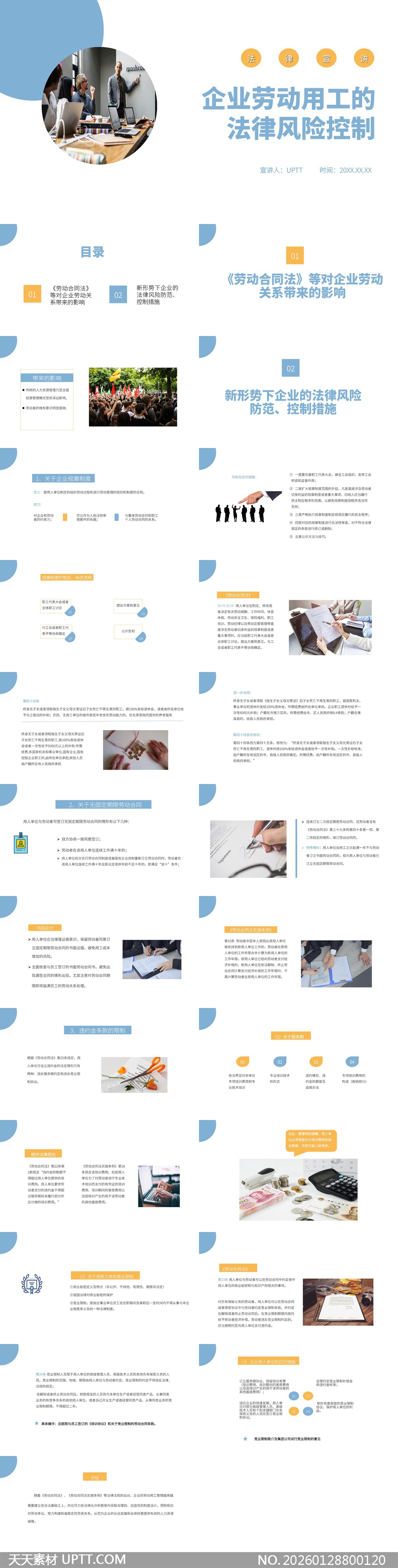 本PPT模板采用蓝白主色调搭配橙色点缀,内含目录导航、法条解读、案例图示、流程图解与实操要点卡片等多元模块,融合真实办公场景图片增强代入感;内容紧扣《劳动合同法》核心条款,系统梳理用工风险高发环节及应对策略,适用于企业HR培训、法务合规讲座、管理层风控会议及高校劳动法教学等场景,助力用户高效完成专业级法律风险防范宣讲。【 素材唯一编号 20260128800120 】,简约类蓝色风格PPTX格式素材下载,文件格式为.PPTX,下载完成后的文件为一个压缩包,素材压缩包大小14.1 MB,请解压后用相应软件打开。